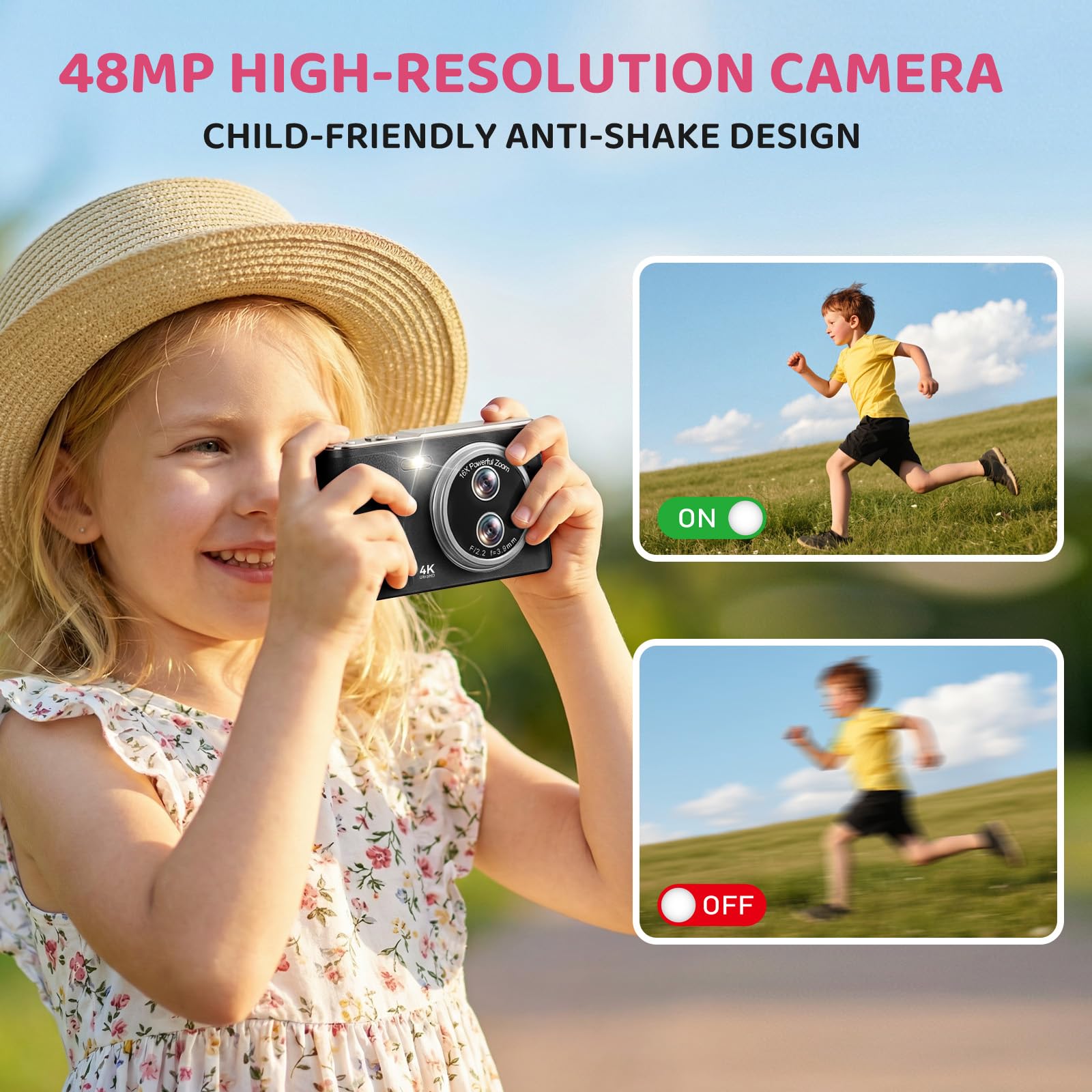 【48MP FHD 1080P Digital Camera】This point-and-shoot digital camera captures both 48MP high-resolution photos and 1080P videos with automatically balanced, natural colors. Whether you're capturing family trips, everyday moments, or creating video content, the camera delivers clear images and smooth videos. Perfect for beginners and kids, simply press the shutter and capture beautiful memories.