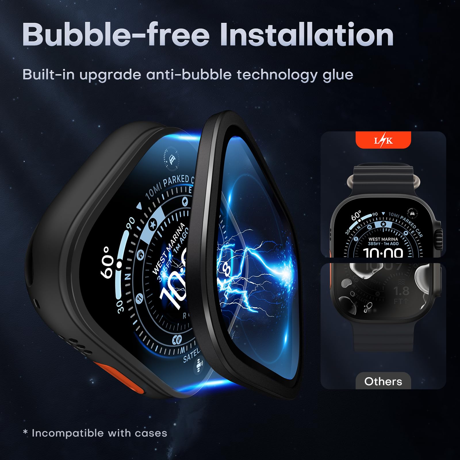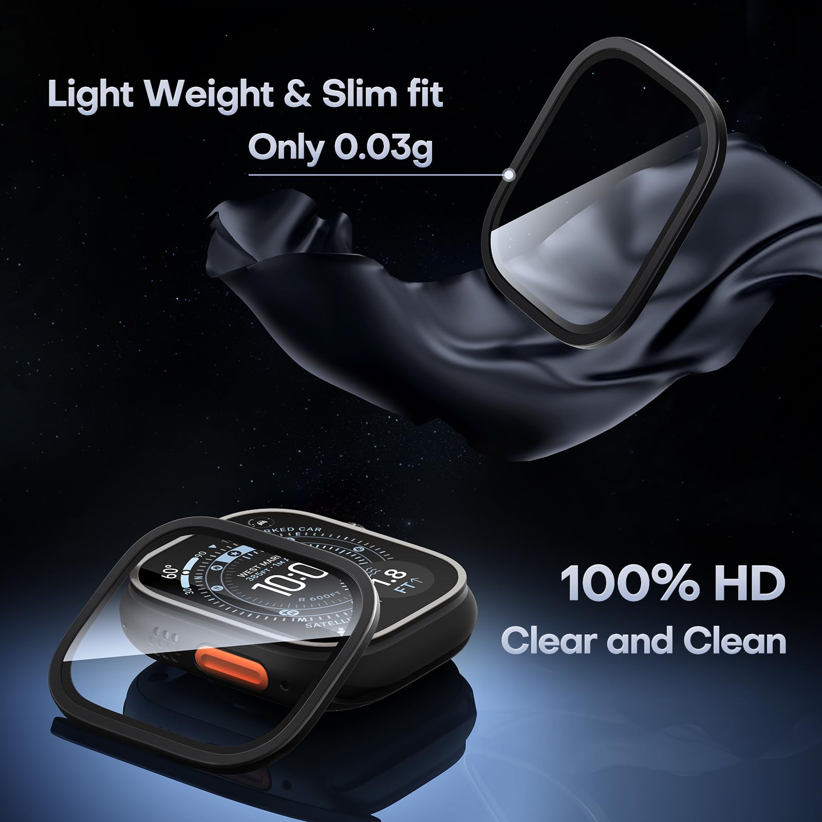 Full Coverage - Upgrade titanium alloy frame, prevent the around of your Apple Watch Ultra from scratch or knock by hard sharp. 9H hardness glass, protect your screen from scratching, collision, falling. Upgraded adhesive, stronger adhesion, HD light transmission, fast automatic exhaust, so you do not need to take off your watch even under water