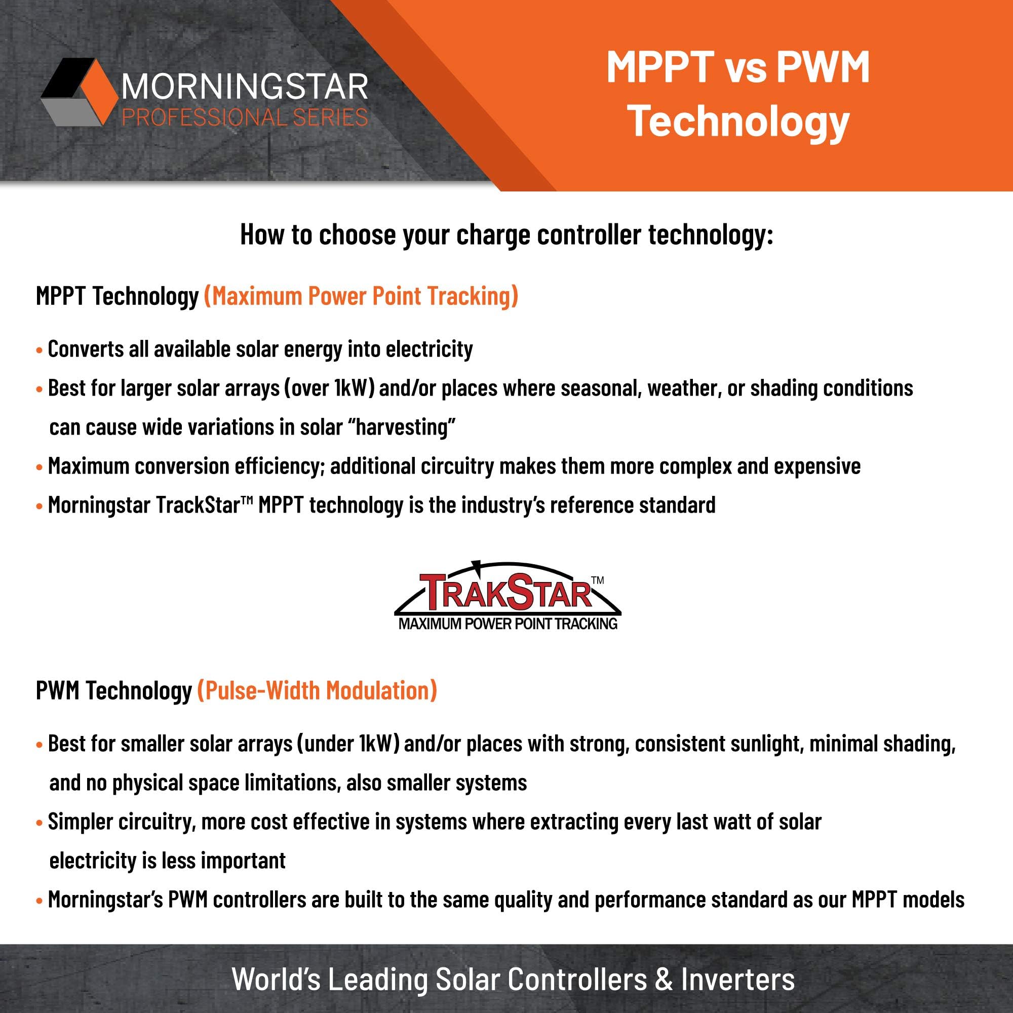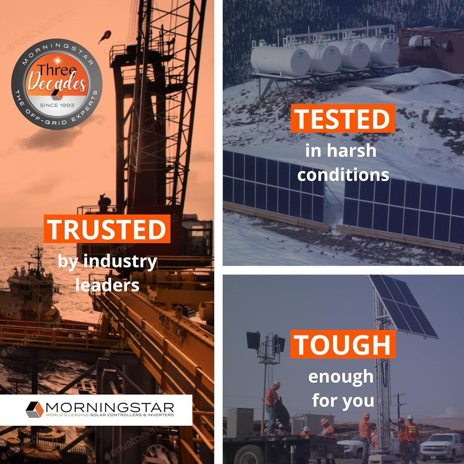 TRUSTED RELIABILITY: Morningstar Corporation is a US company established in 1993 and is a global leader in manufacturing PWM and MPPT solar charge controllers, inverters, and accessories. Renowned for the industry's lowest hardware failure rate, Morningstar provides dependable, innovative technology for advanced solar applications. Morningstar products include U.S. based Tech Support and are the top choice for mission-critical users.