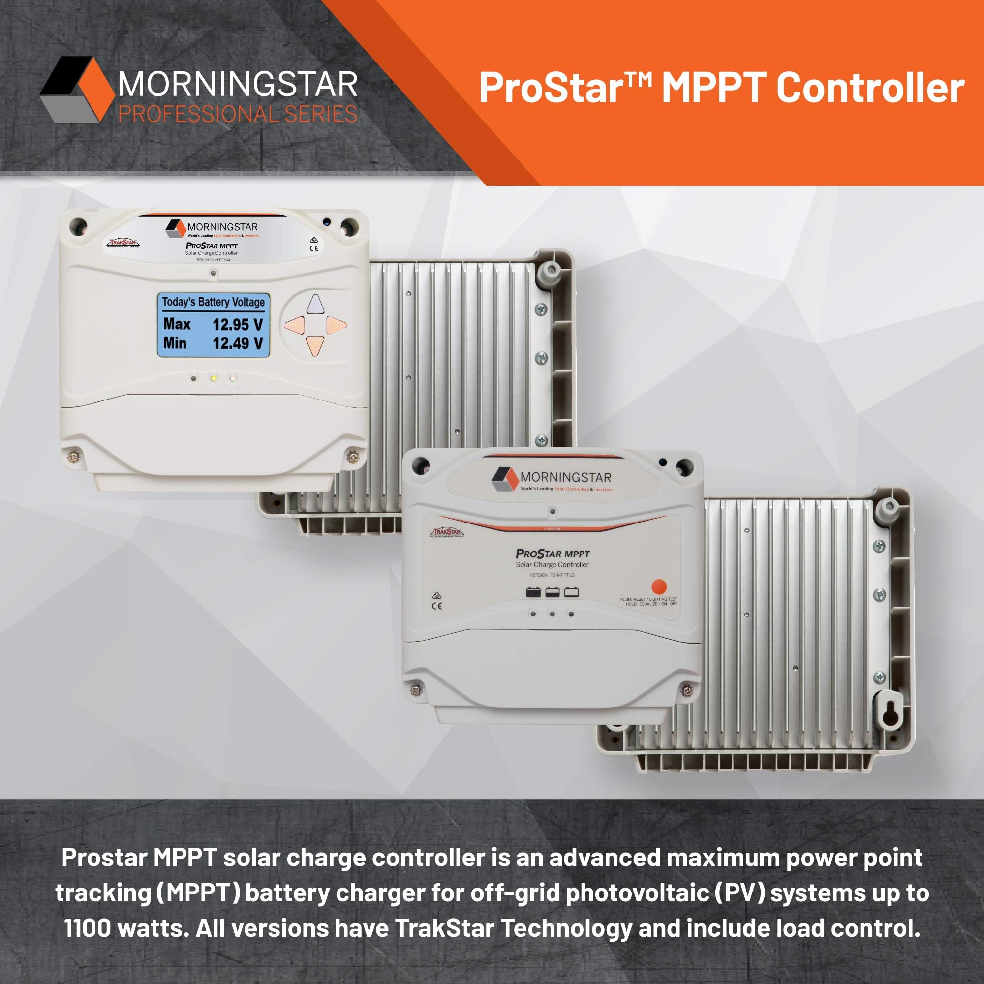 40A MPPT CONTROLLER: Morningstar ProStar MPPT (Maximum Power Point Tracking) 40A solar charge controller delivers reliable charging for off-grid solar systems. It regulates power from the solar array that it delivers to batteries. Benefit from ProStar MPPT's 98% efficiency, lower self-consumption of power, and consistent energy harvesting to prolong battery life.
