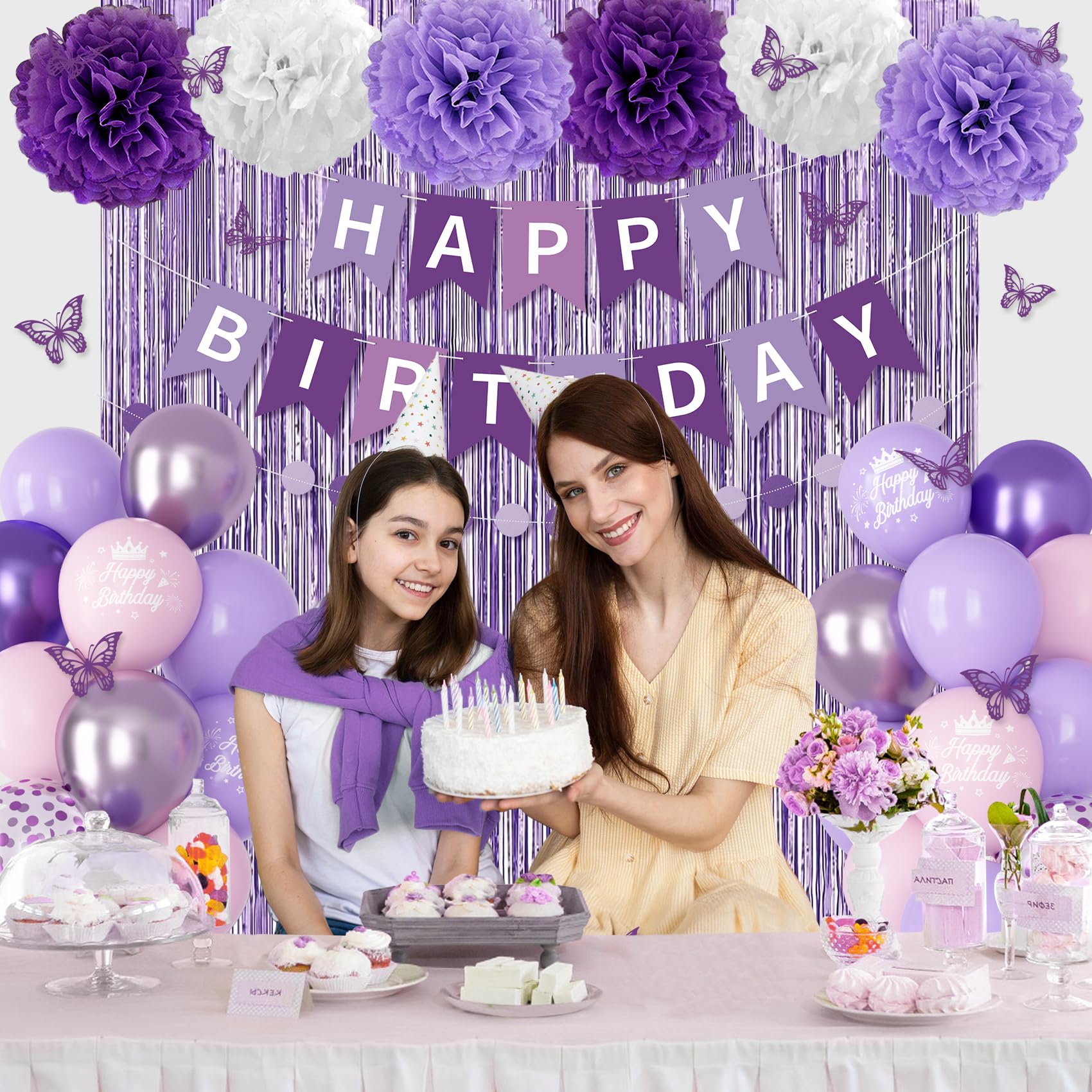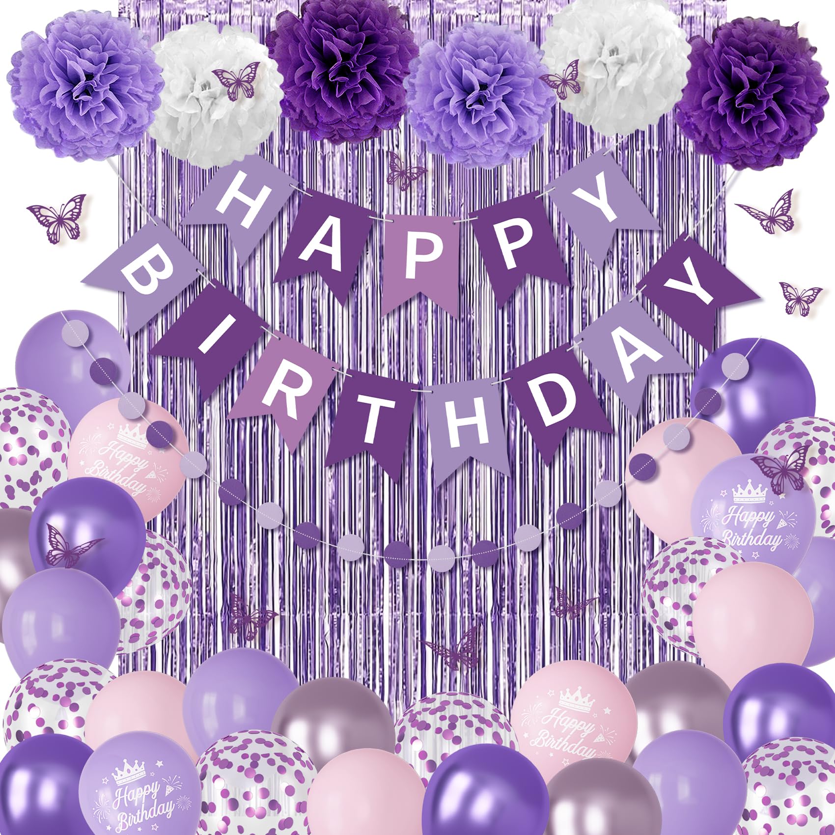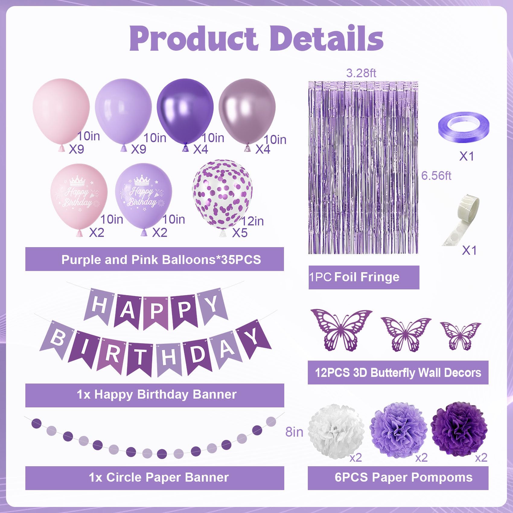 Purple Birthday Decorations: Includes 5pcs 12’’ confetti balloons, 30pcs 10’’ balloons(11pcs pink/11pcs purple/8pcs metallic purple); 6pcs paper pom poms; 1pc foil fringe curtain; 12pcs butterfly; 1pc happy birthday banner; 1pc circle banner and tools