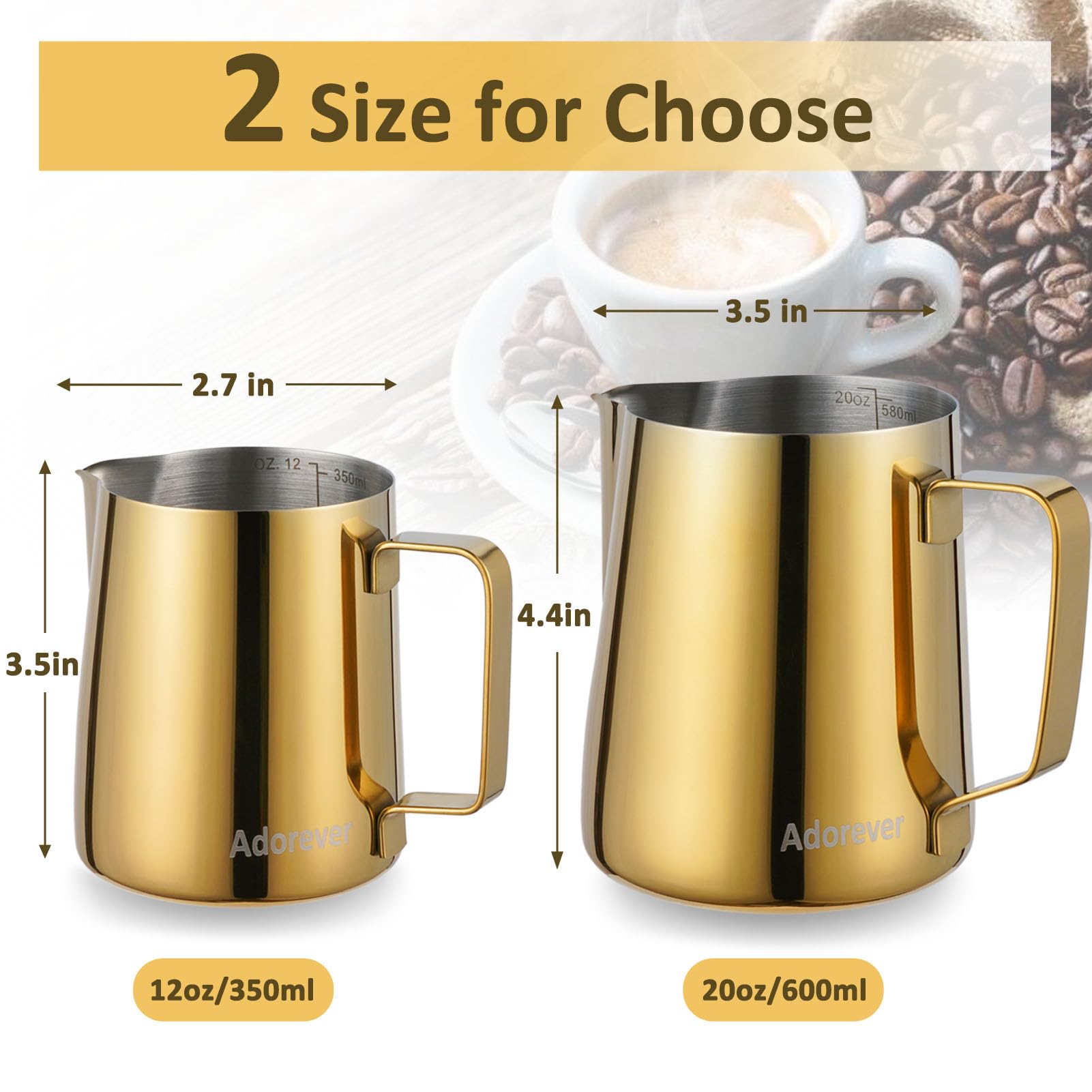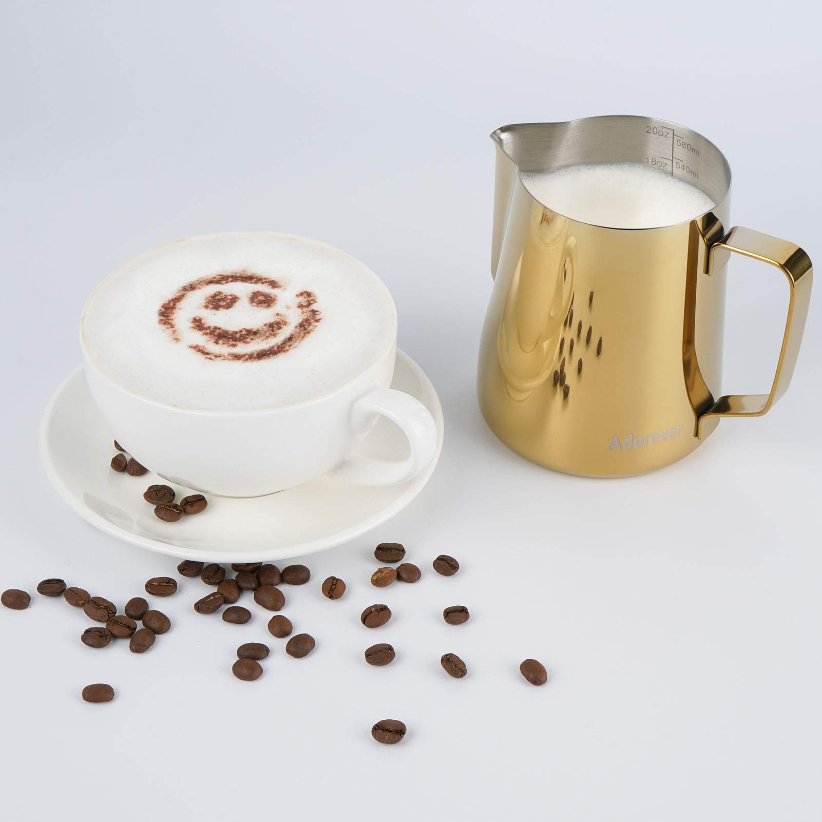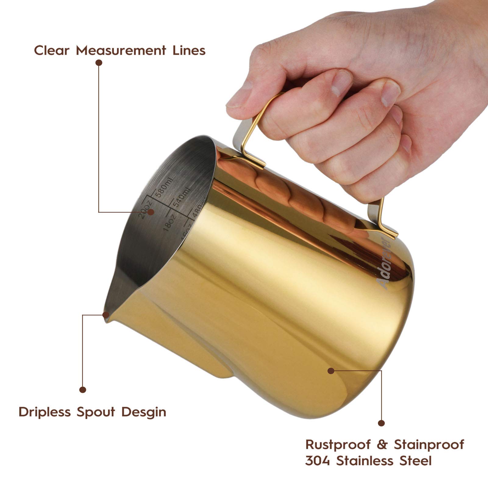 Various Colors For Choose: We have stainless steel/ black/ rainbow/ gold/ rose gold/ blue colors for choose. In Adorever, we can meet your different demands of frothing pitcher.