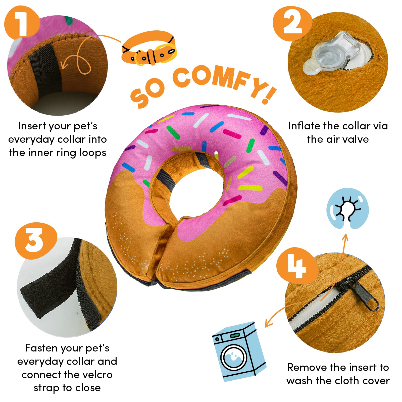 DESIGNED TO LAST - The protective dog cone is not just soft and washable but also featured scratch and bite resistance. It will not mark, scrape or damage your furniture. The materials we selected are meant for durable and long-lasting use. You can insert your pet’s everyday collar through the inner ring loops for stabilization.