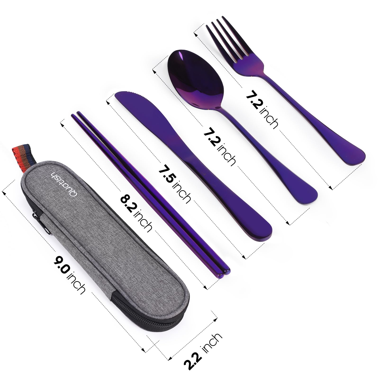 5 PCS Utensils Set: The minimalist set comes with an adult-sized fork, spoon, knife, chopsticks, and carrying case. The chopsticks are desighed with reinforced laser etching, for better anti-slip and grab the food