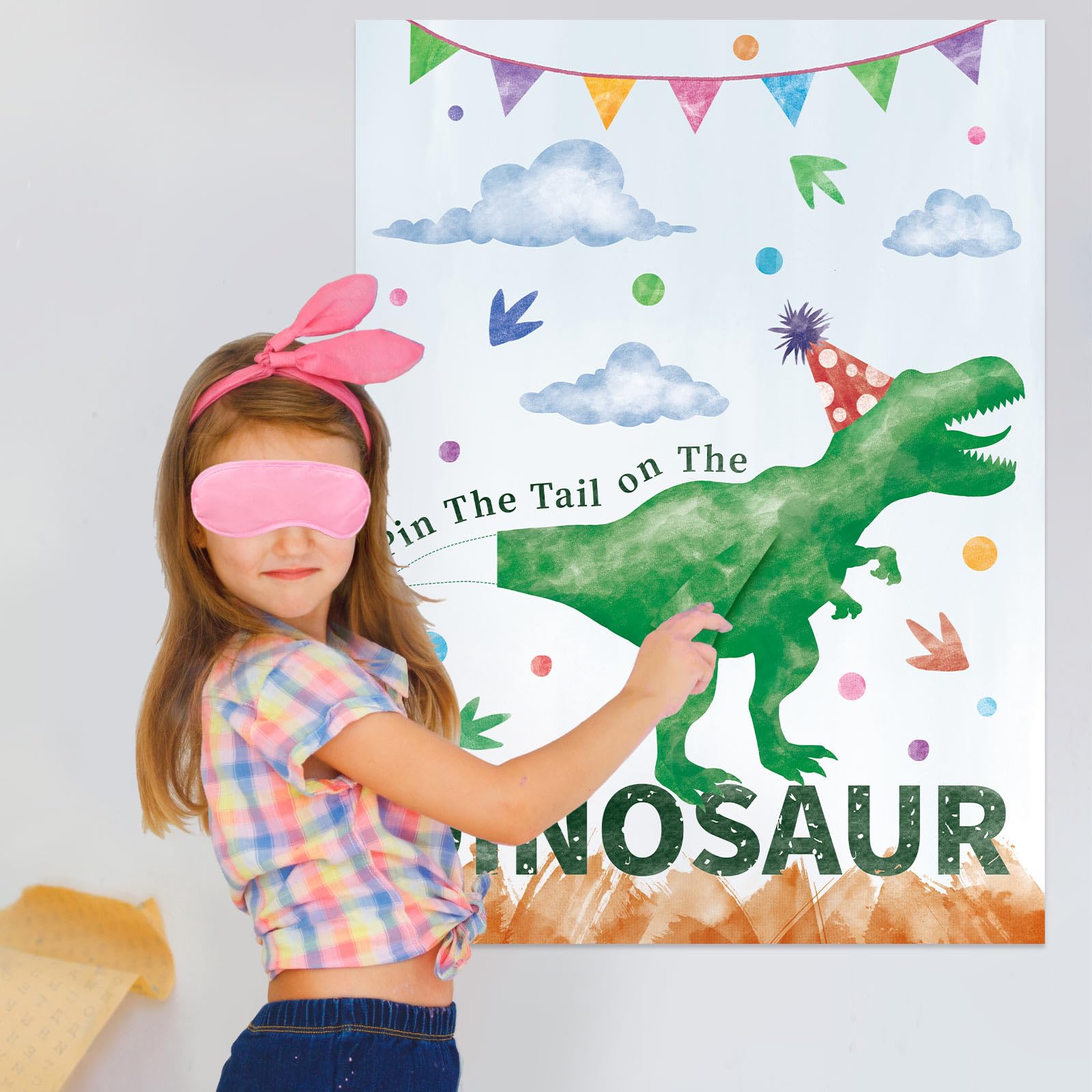【Easy to Play】Put the poster on the wall with glue dots, then take turns to put on a blindfold, take a tail and pin it on the dinosaur, and the one who stick most accurately is the final winner.