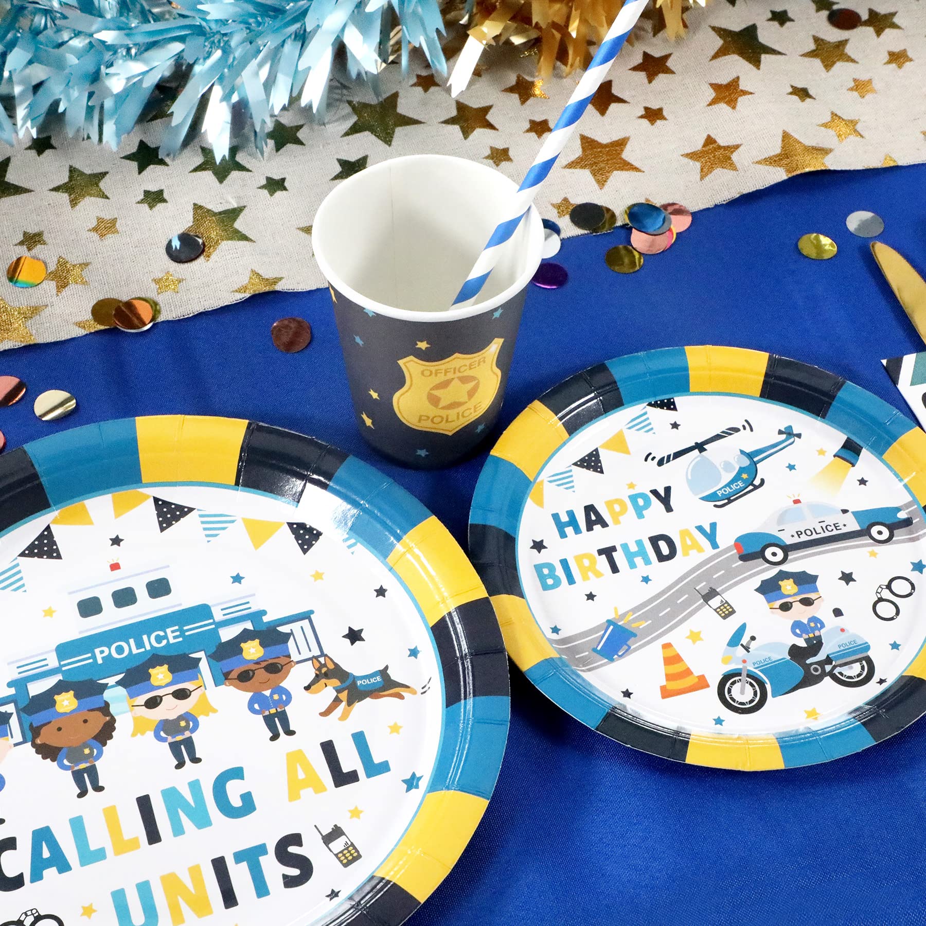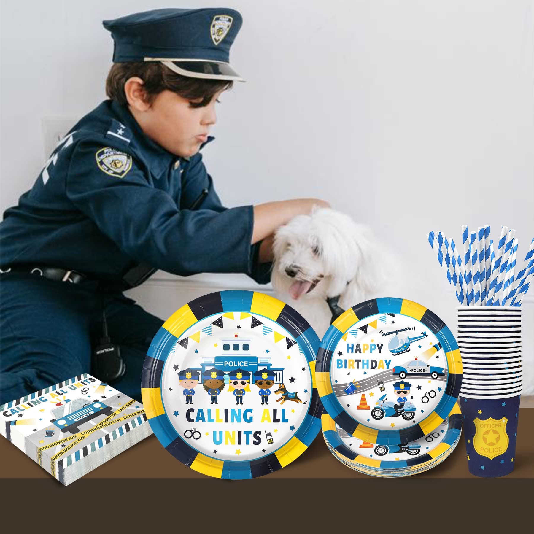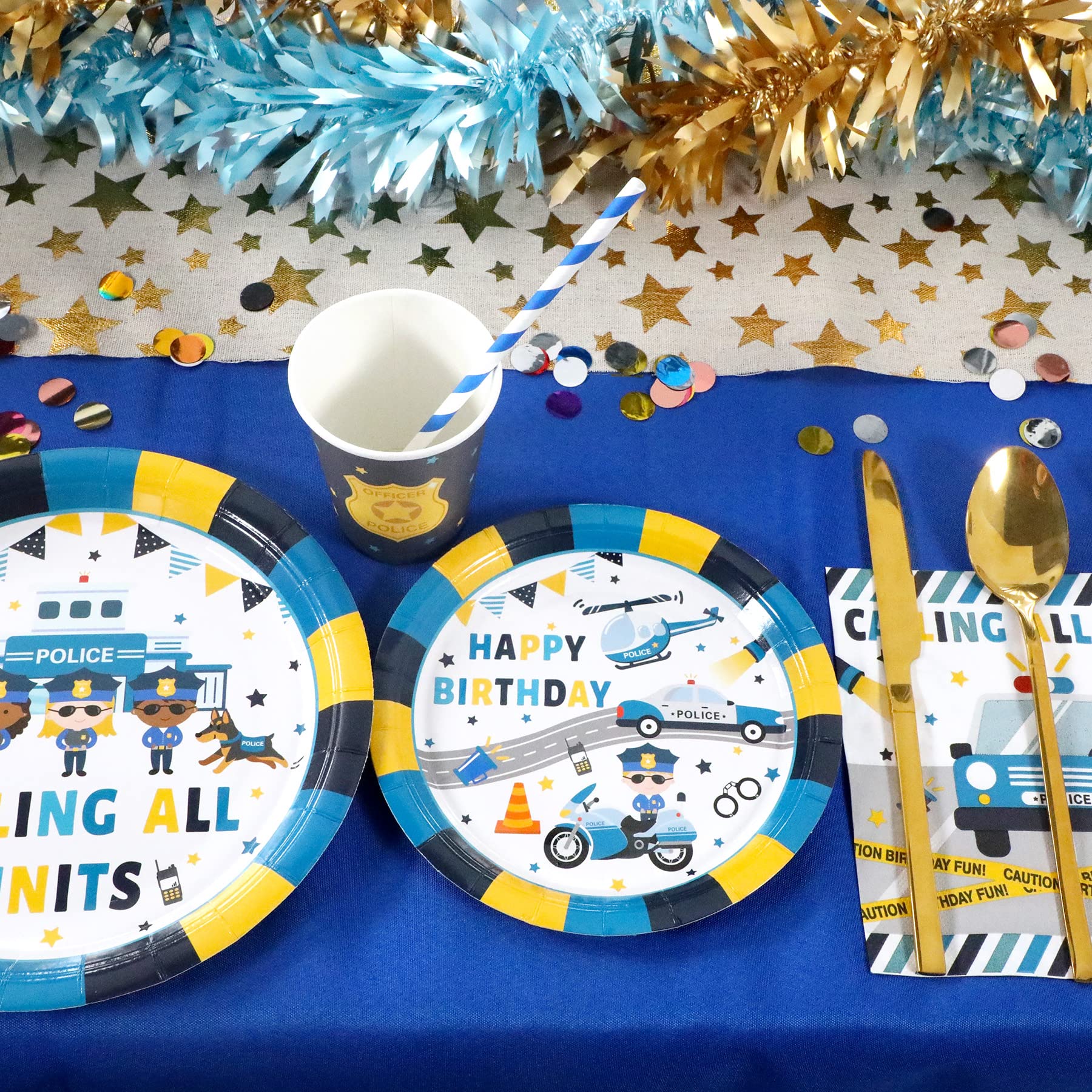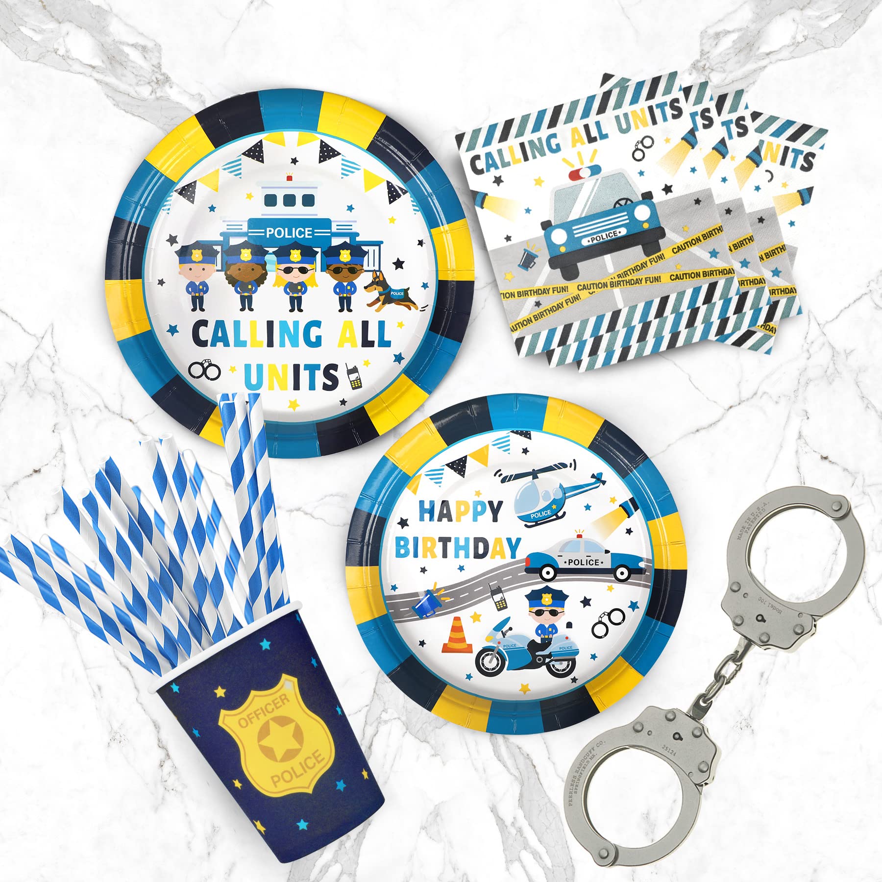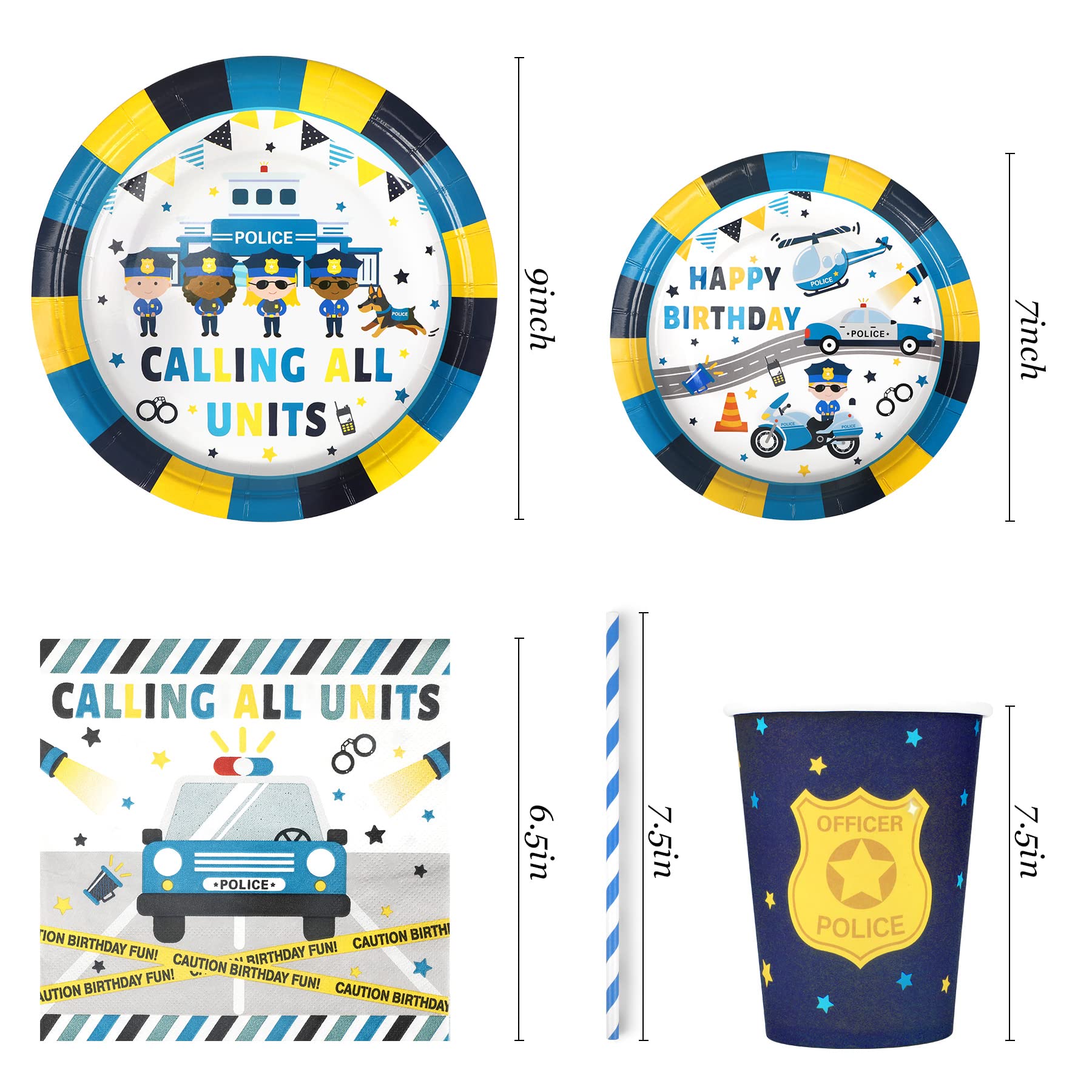 【Serves 24 Guests】: The police disposable dinnerware comes with 9" dinner paper plates *24, 7" paper dessert plates *24, 9oz paper cups *24, 6.5" napkins (3 layers) *24 and paper straws *24. The durable dinnerware set allows you to serve 24 guests at one time.