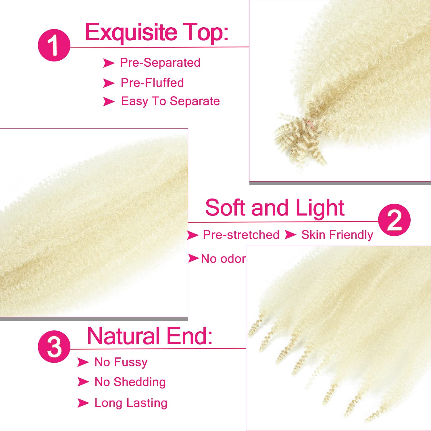Advantage: springy afro twist hair Is Soft On Skin & Ultra Lightweight, No Smell, Easy To Separate, No Fussy Or Shedding, Pre-Separated & Pre-Fluffed For Easy Installation