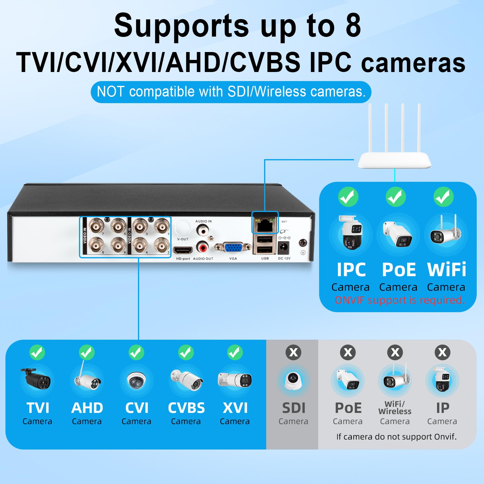 【8-channel High Capacity】Our 8 channel dvr can connect up to 8 surveillance cameras at the same time, and supports AHD/TVI/CVI/CVBS/XVI camera 5-in-1 access mode.This large-capacity design allows you to flexibly layout the camera and fully control each monitoring point, whether it is a large shopping mall, warehouse, factory workshop, or complex environment such as multi-storey residential, school campus, can achieve a full range of monitoring without dead corners.