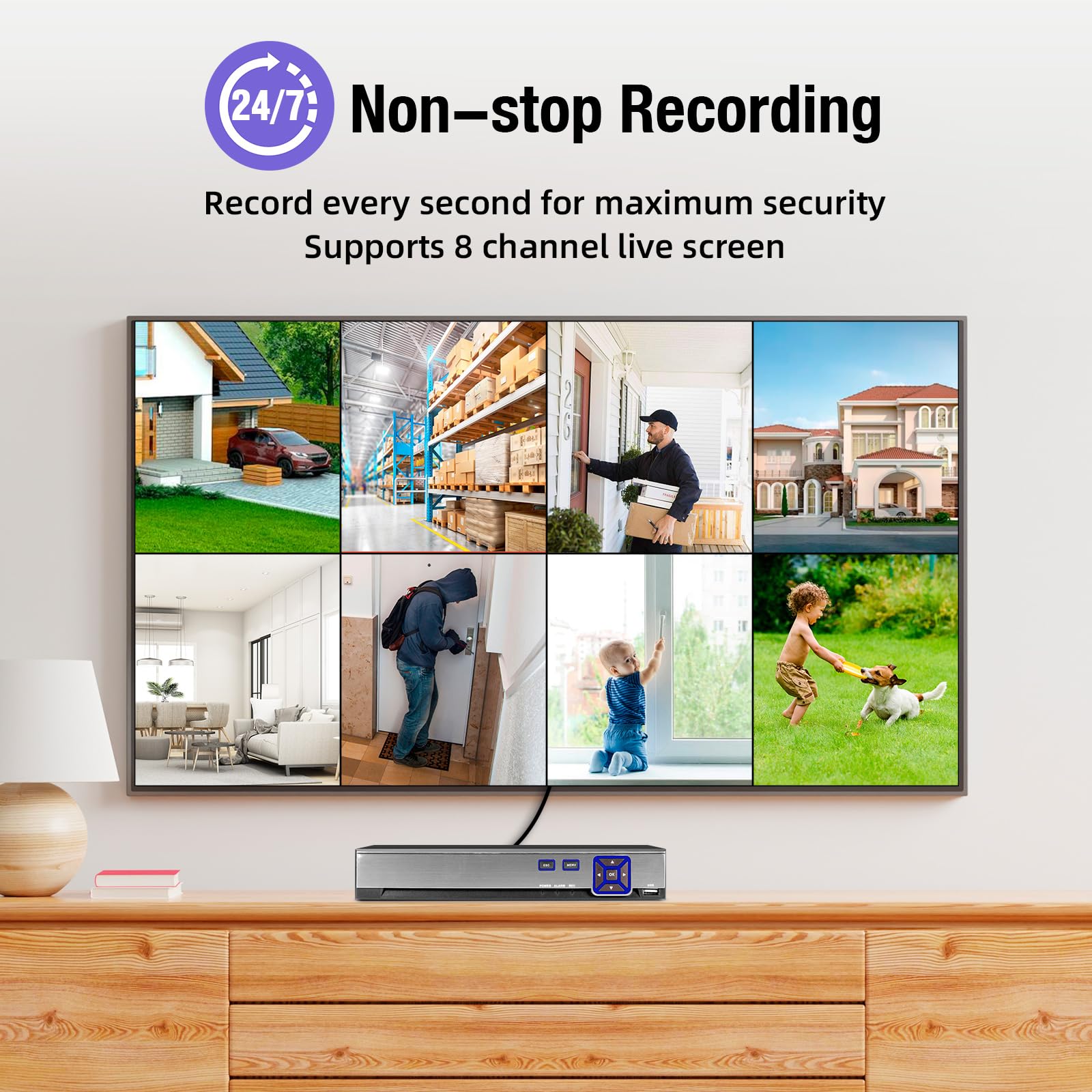 【Reliable Security Storage】With our 5MP 8-channel DVR equipped with an advanced storage system, enjoy 24/7 video recording without missing a moment. It uses reliable data storage technology, so that your surveillance video can be stored safely and stably.Built-in 1TB large hard disk, large-capacity storage options can meet the needs of long-term recording, you do not need to worry about storage space shortage and loss of important data.
