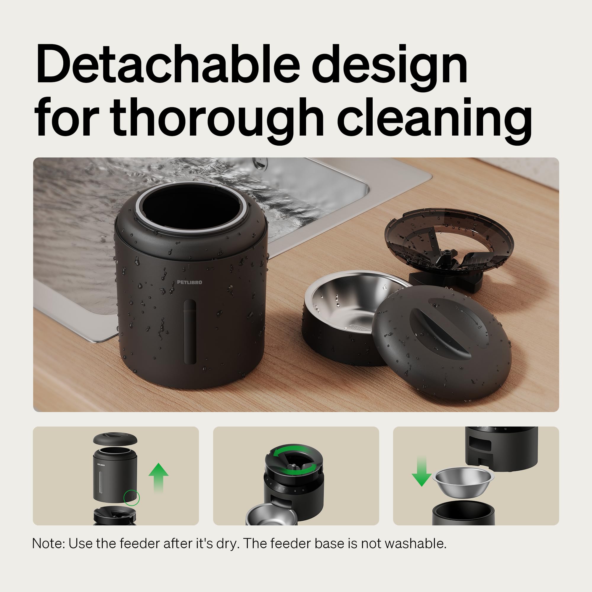 Freshness in Every Bite: Patent rotor in the tank base and twist-lock lid of the automatic pet feeder prevent pets sneaking into the food dispenser for extra food. Built-in desiccant bag and sealing strip keep food fresh and crunchy. Food-grade stainless steel bowl provides healthy and hygienic feeding, saving your pets from chin acne.