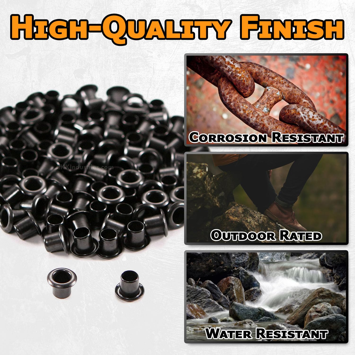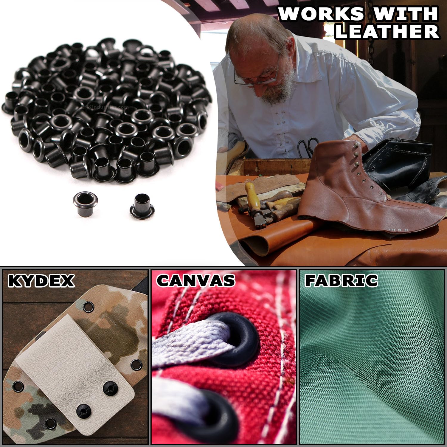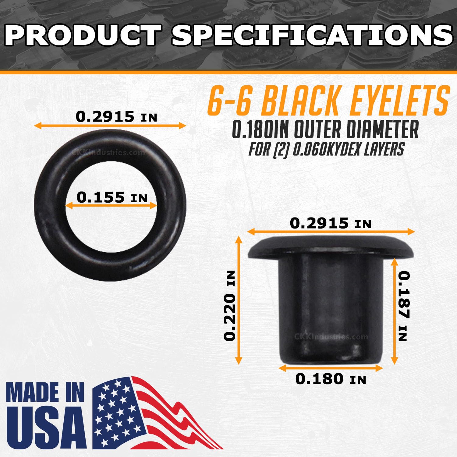 Color/Finish: Black | (#1 Best coating finish in the industry!) | These are the industry standard eyelets (sometimes called binding rivets) that are used in DIY thermoform holster and knife sheath making. They are also commonly used in making leather knife sheaths and gun holsters, and can be used in upholstery and garment manufacturing as well.