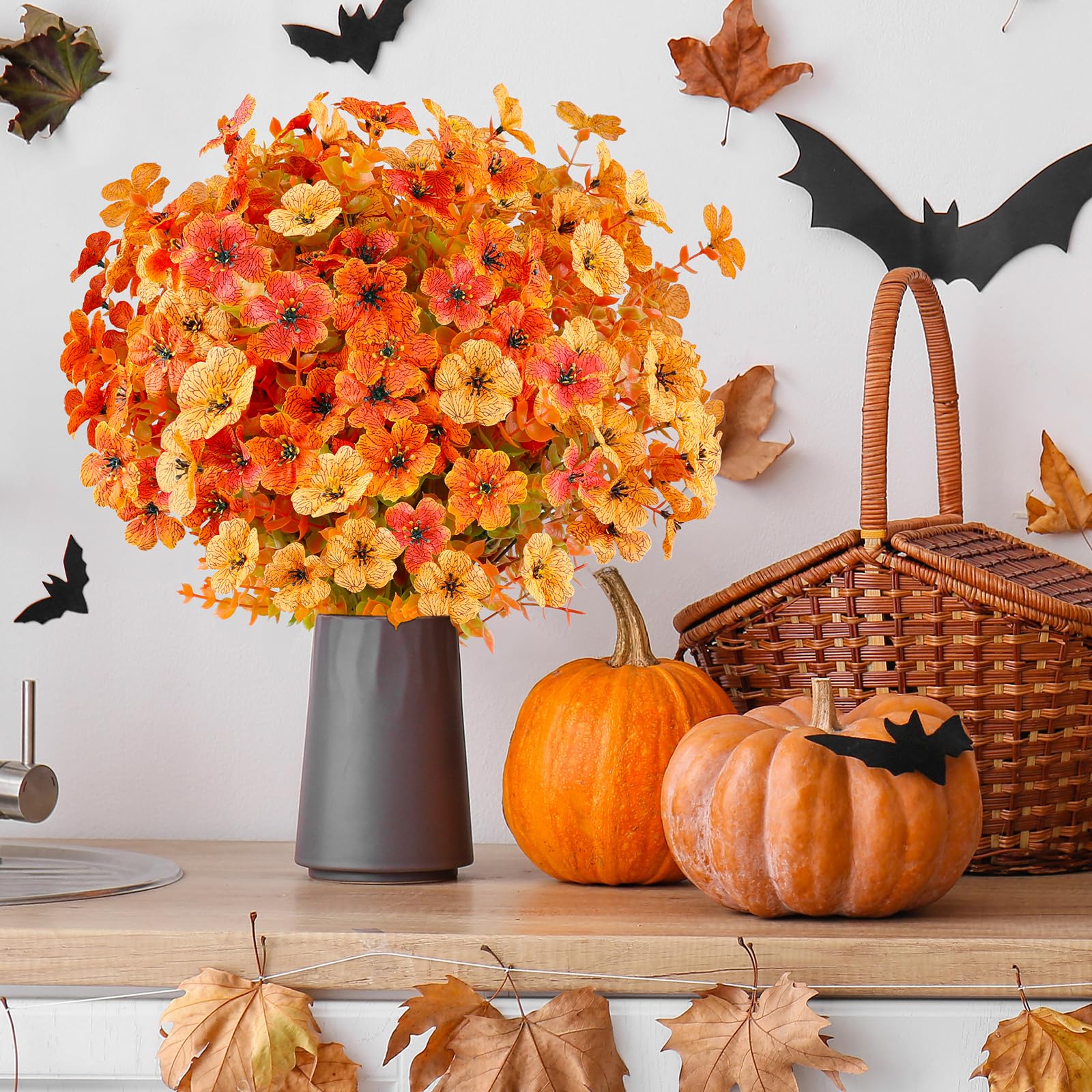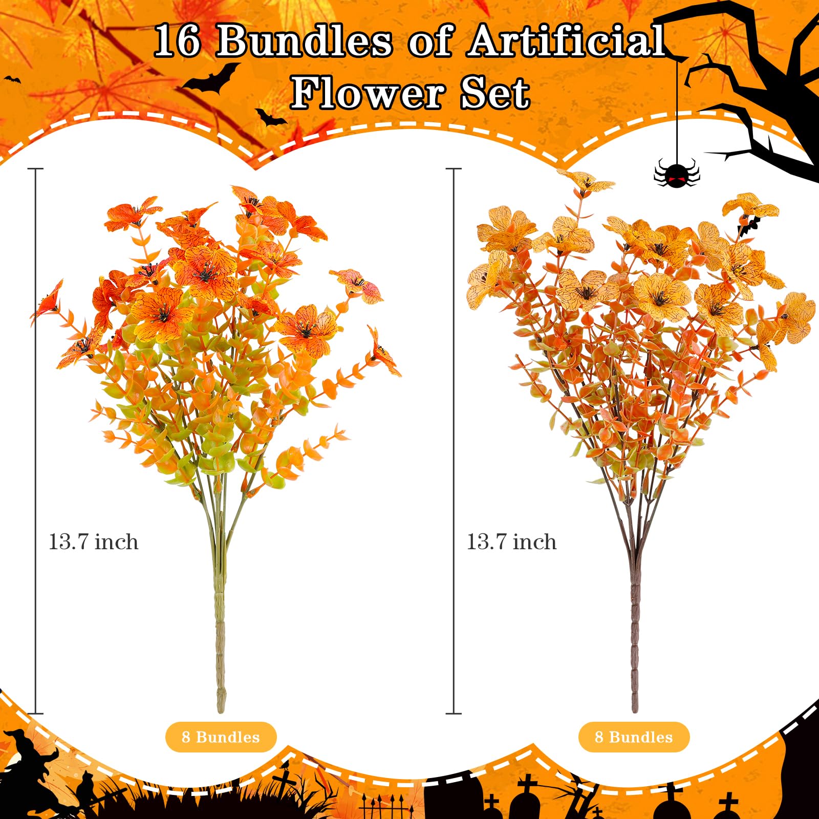 16 Bundle Super Value Set - You will get 16 Bundles of fall artificial flowers, 6 bundles of yellow eucalyptus flowers, and 6 bundles of orange eucalyptus flowers. Each eucalyptus flower has 7 flexible branches, a detachable branch length of 3.15 inches, Full Size of about 13.7 inches (adjustable)