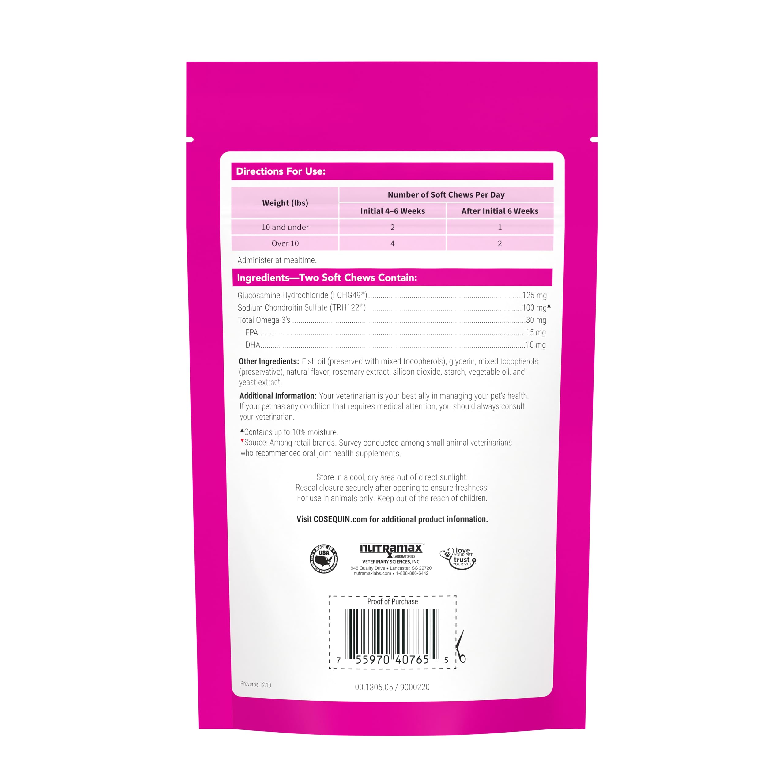 Cosequin for Cats Soft Chews combine glucosamine hydrochloride and chondroitin sulfate for joint support and include omega-3 fatty acids to help support skin and coat health, and overall wellness. Each bag contains 60 soft chews for cats of all sizes. Cosequin joint health supplements are brought to you by Nutramax Laboratories Veterinary Sciences, the #1 veterinarian recommended supplement company. ▼Source: Among retail brands. Survey conducted among small animal veterinarians who recommended oral joint health supplements. *Source: Survey conducted among small animal veterinarians who recommended animal supplements.