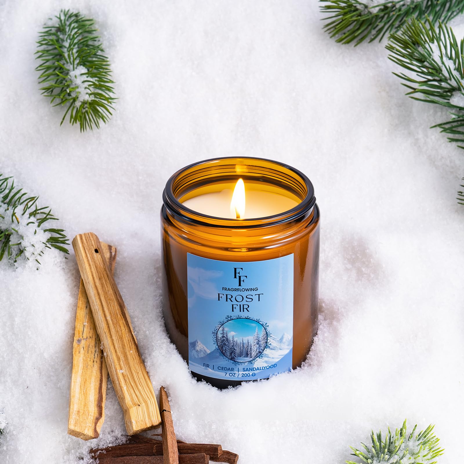 Frost Fir Scented Cande: Embrace the serene essence of a snow-blanketed forest with our Frosty Fir candle. The crisp, aromatic notes of fir needle blend harmoniously with the depth of cedar and the creamy warmth of sandalwood, evoking a tranquil walk through a silent, frost-kissed woodland