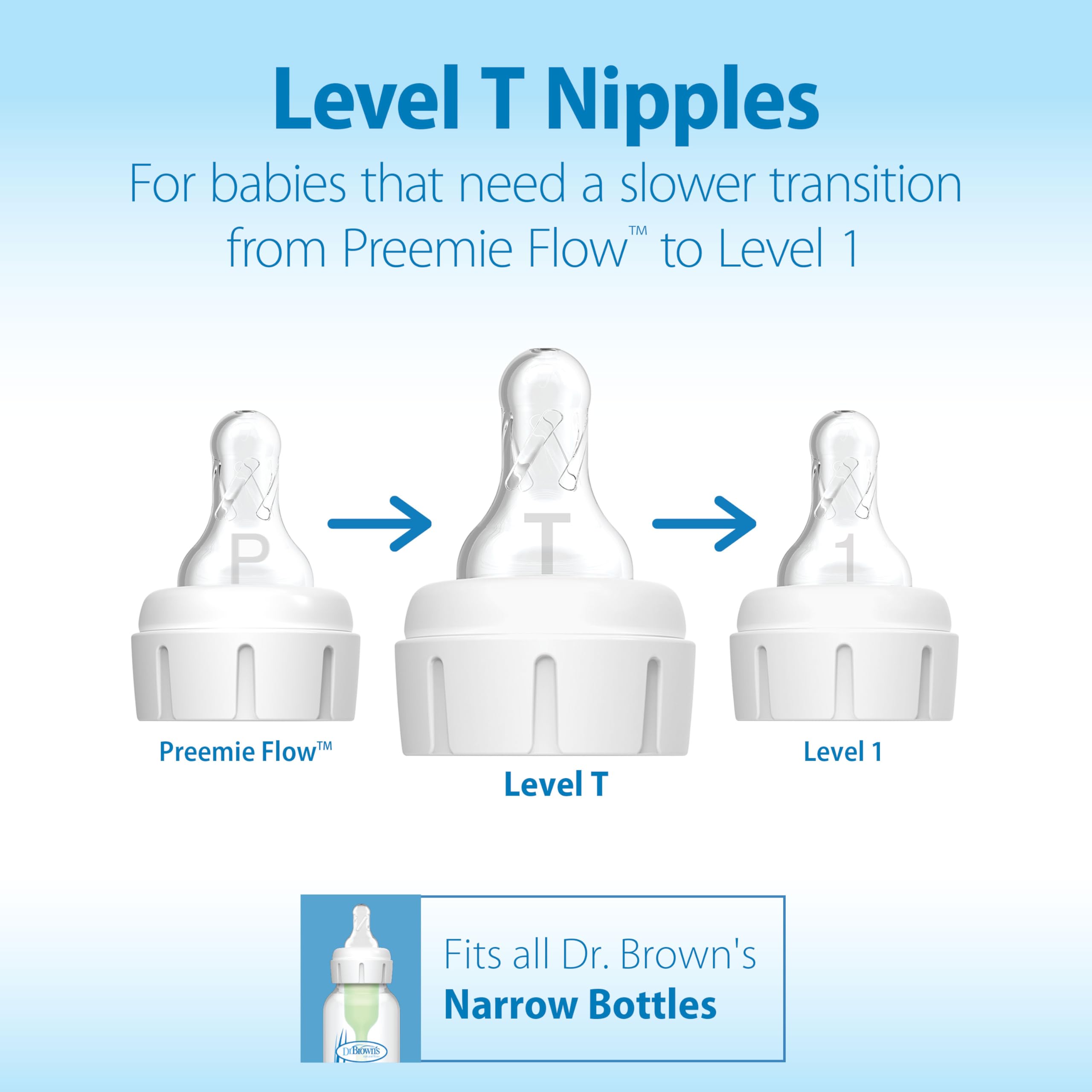 LEVEL T NIPPLE FOR NEWBORNS. The Level T Narrow Nipple is designed for babies requiring a slower flow nipple than Dr. Brown's Level 1 Nipple or needing to transition up slowly from Dr. Brown's Preemie Flow Nipple.