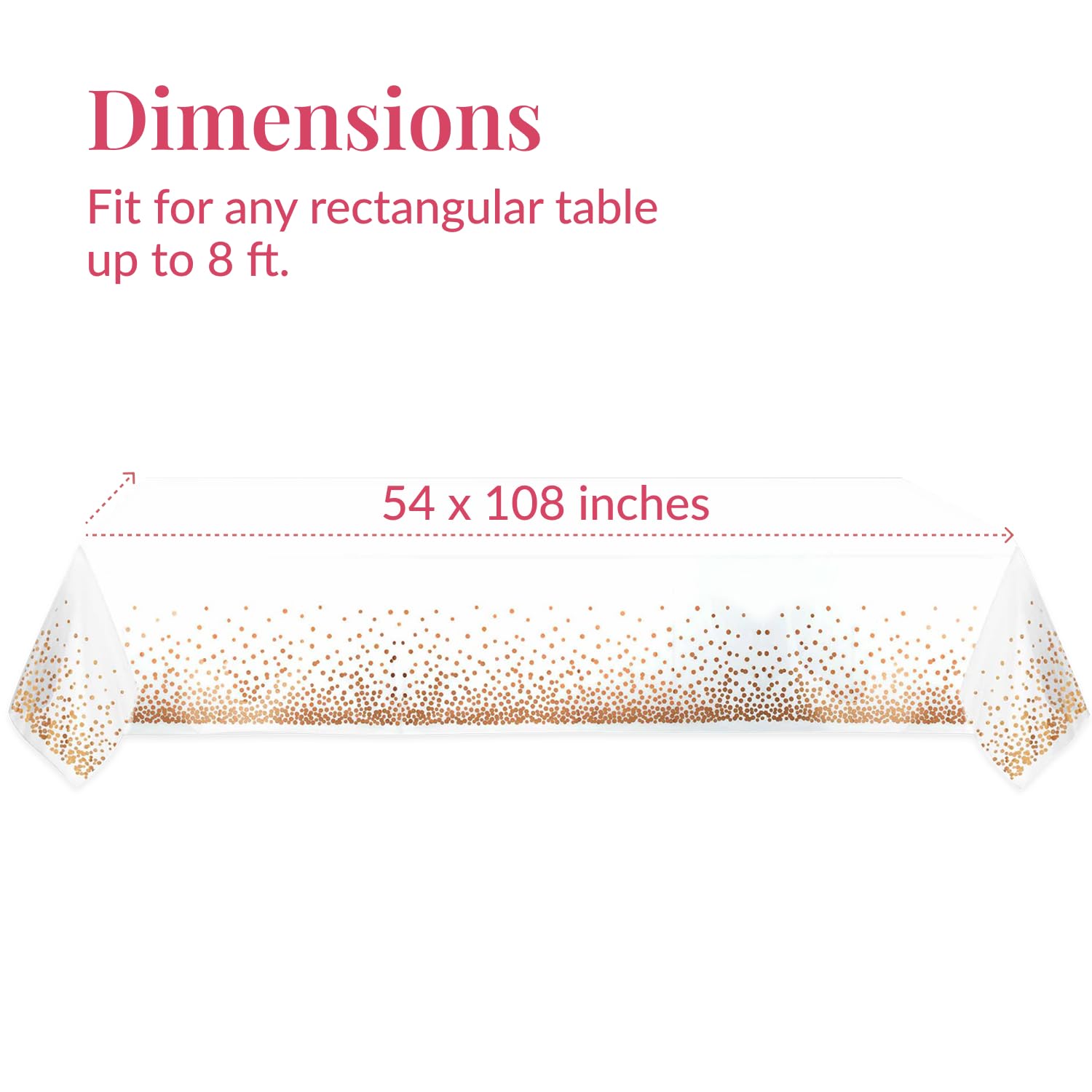 Versatile and Recyclable: Each of these rectangle table cloths pink and gold measures 54 x 108 inches, fitting tables up to 8 ft long; disposable and recyclable for convenient cleanup