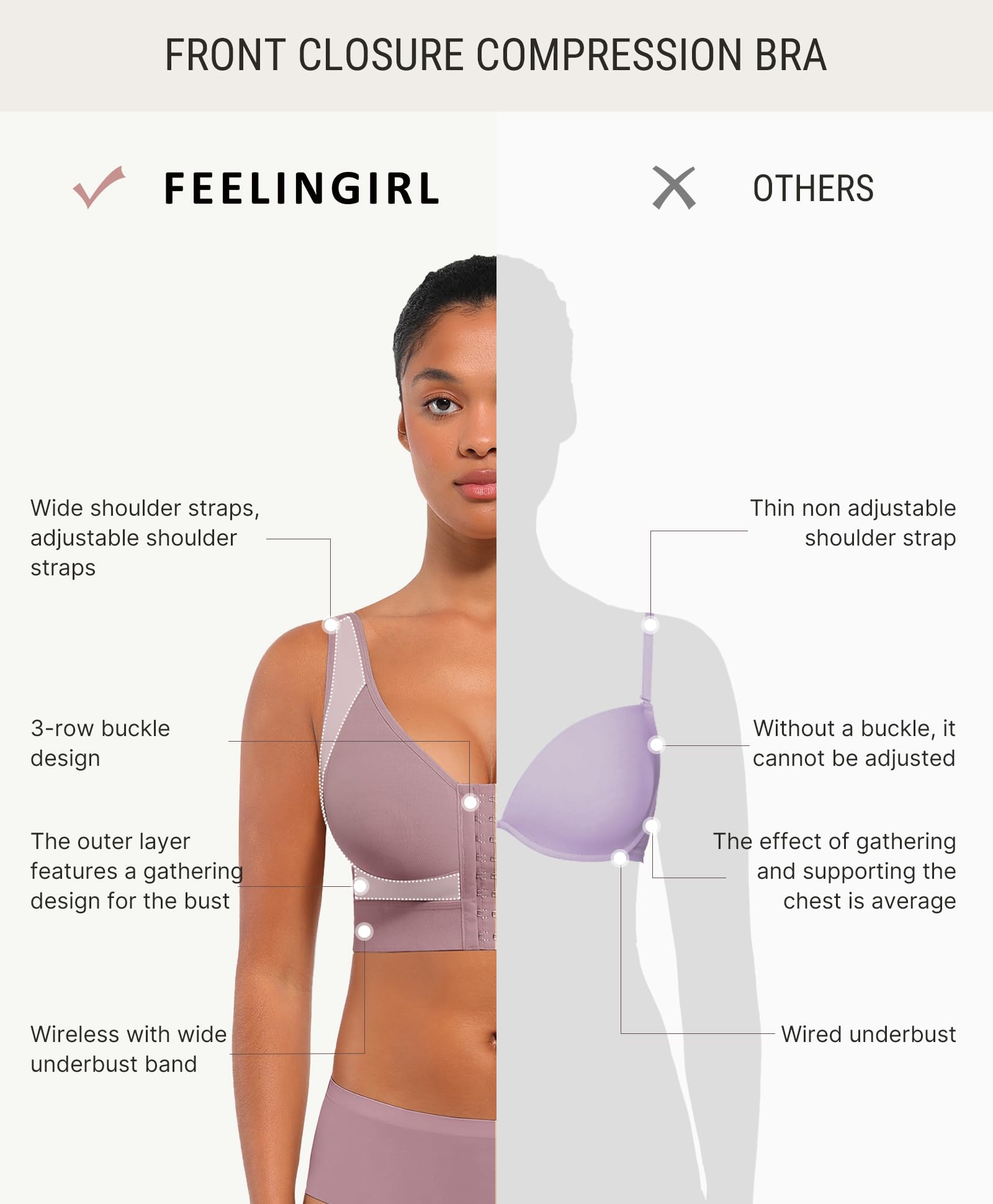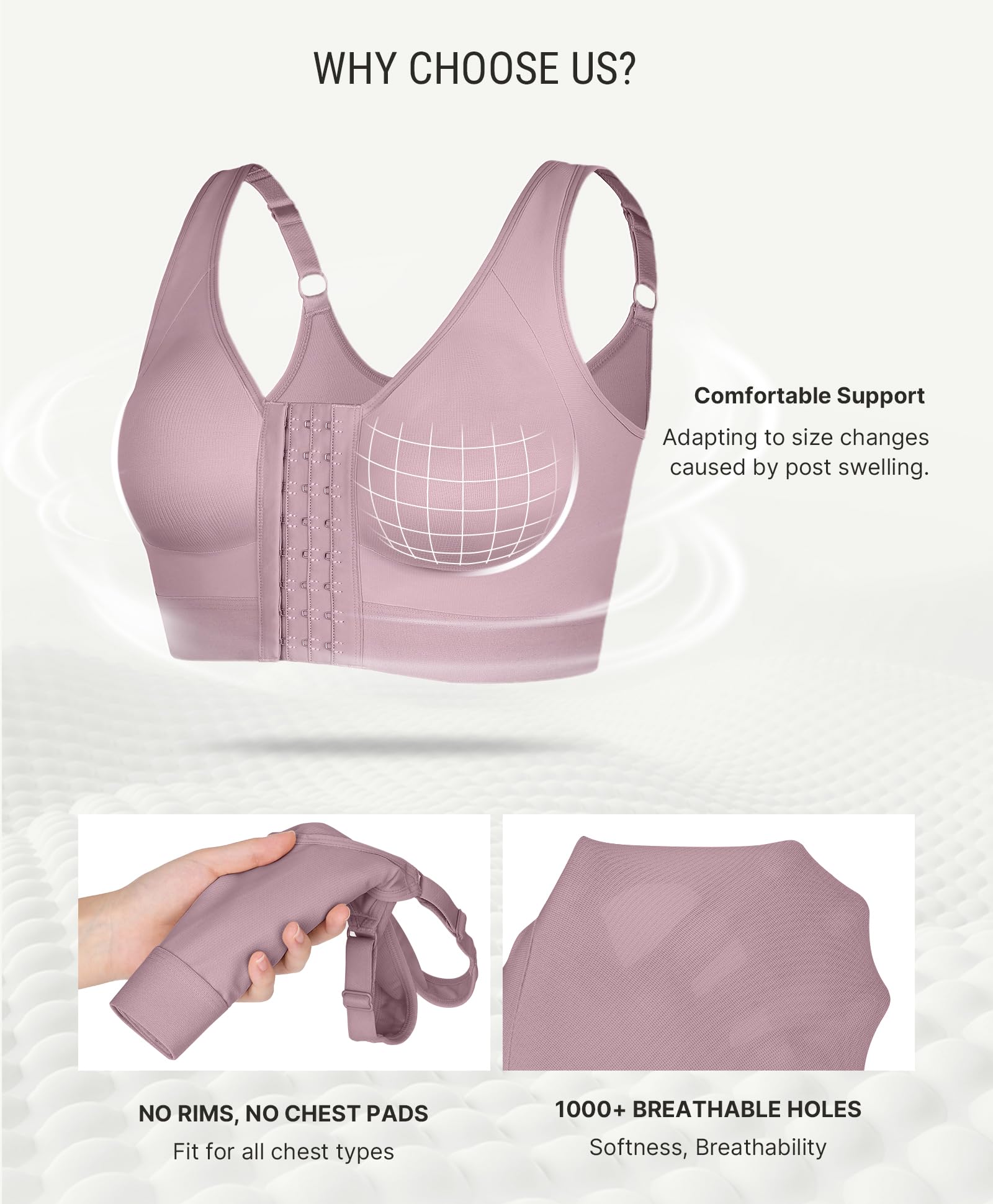 EXTRA PRESSURE BANDS & MOLDED CUPS: The surgery bra sides and bottom of the bra feature elastic bands to enhance breast gathering and support. Unlike ordinary wireless bras, we use molding techniques to create a three-dimensional breast shape, providing a seamless and comfortable fit that is especially suitable for post-surgery wear.