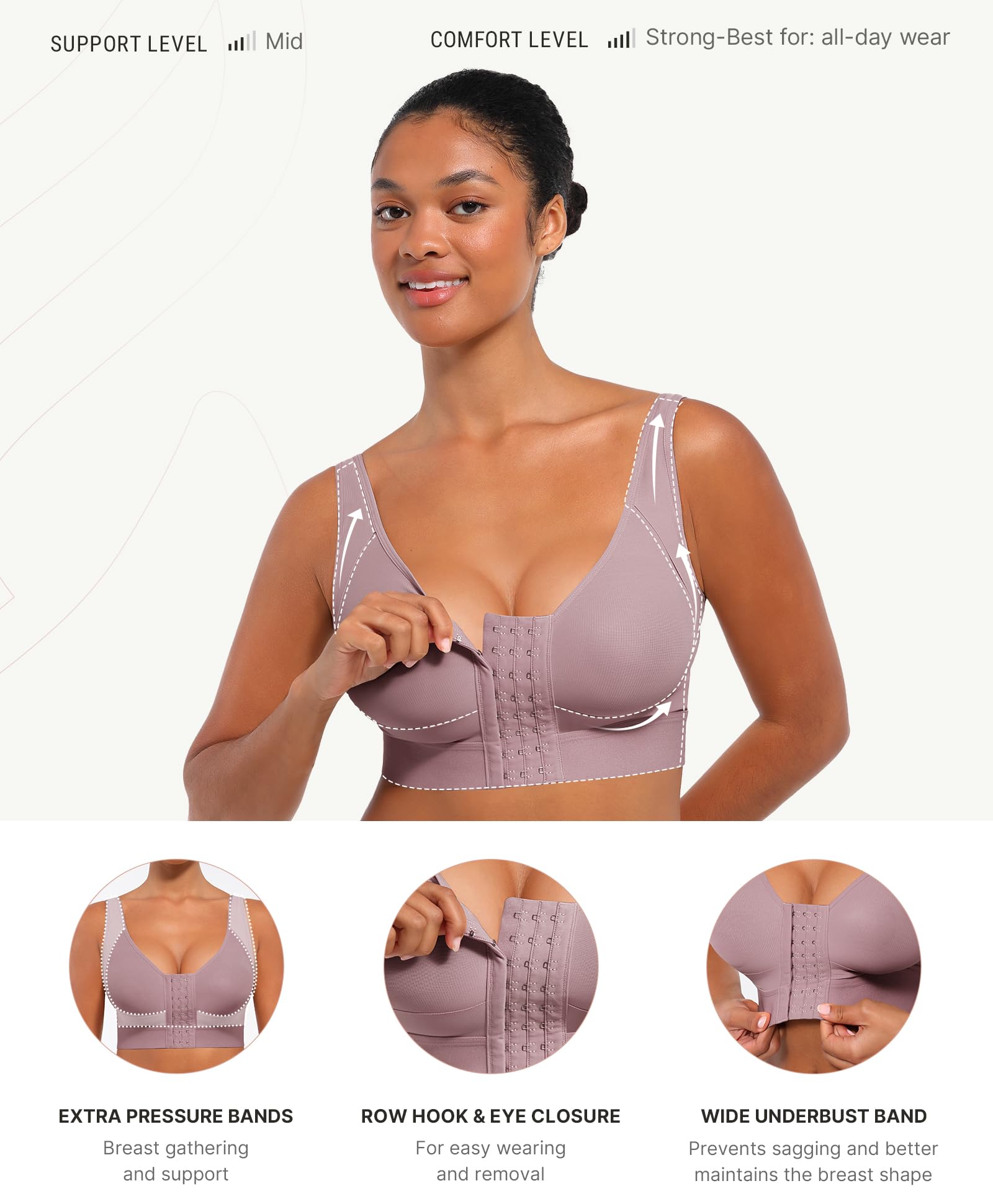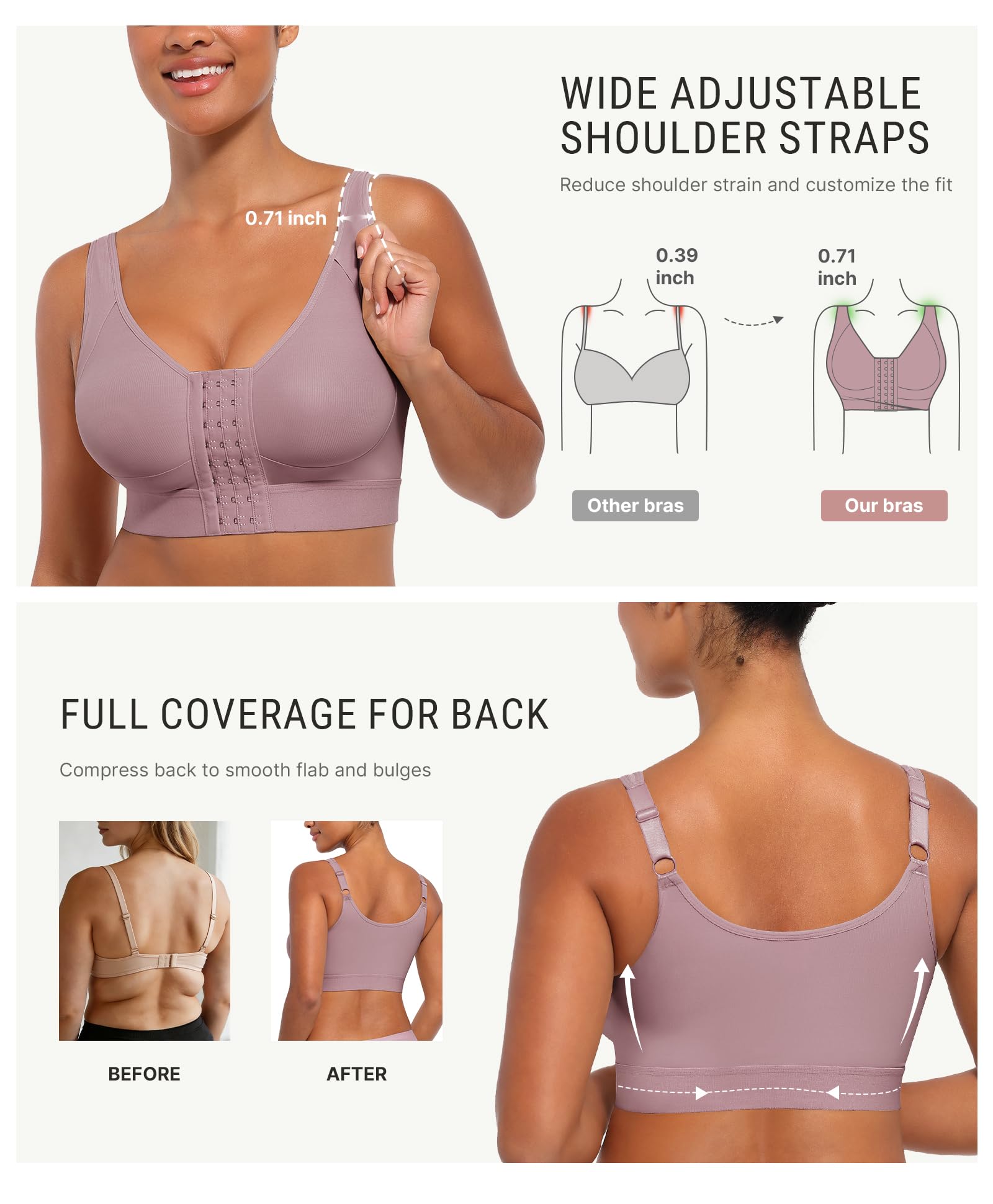 EASY ADJUSTMENTS: Our shaping compression bra offers versatile adjustments to accommodate various cup sizes effortlessly. The front closure bra features three rows of adjustable hooks, allowing you to find the most suitable fit during your recovery. The wide shoulder straps gently distribute pressure to reduce shoulder strain, and the adjustable straps allow you to customize the fit, ensuring a more personalized and comfortable experience for your bust.