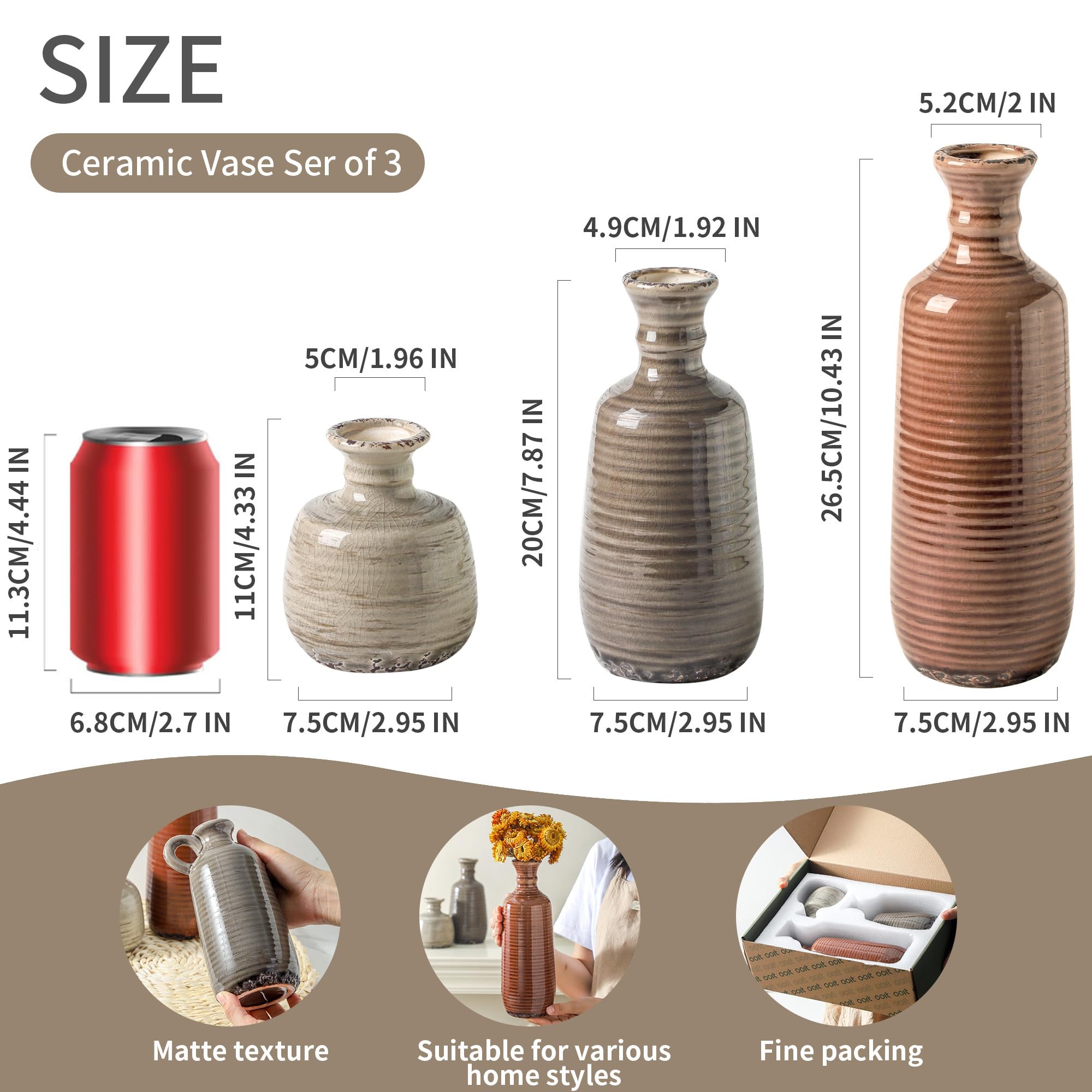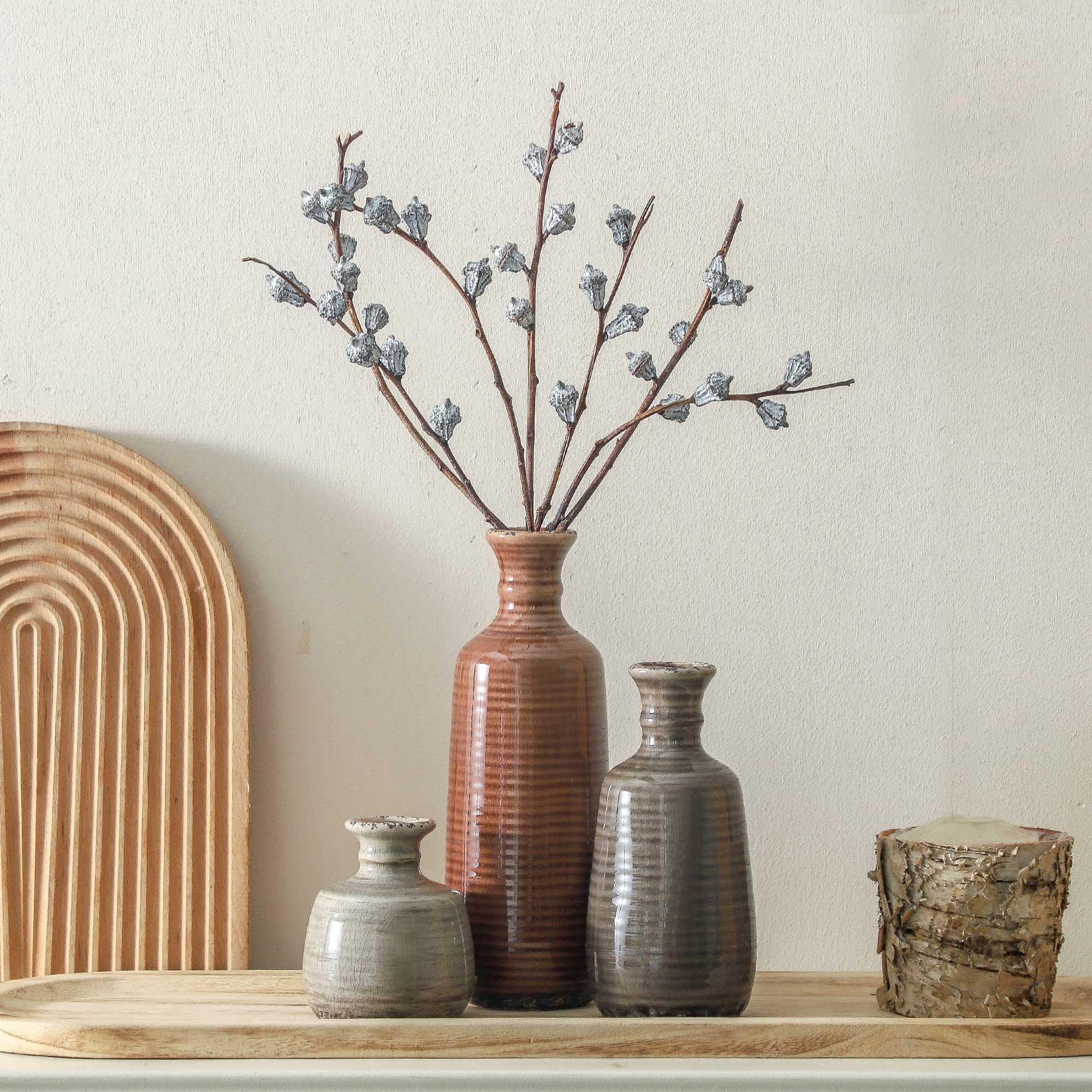 【For Multiple Home Décor Styles】Designed in a variety of shapes and sizes, this rustic vases set is a perfect home décor even without flowers. Whether your style is bohemian, modern farmhouse, rustic, or homey, they all fit in perfectly show off your lifestyle and decorative sense of style. (Length X Diameter=10.43x2.95", 7.87x2.95",4.33x2.95").
