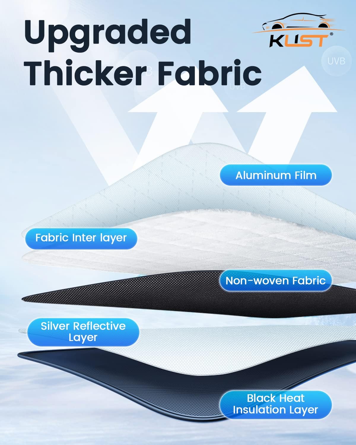 【5-Layer Thicker Quality Shade】Made of thicker and resistent reflective material,KUST Windshield Screen is thick enough to block 99.99% light and sun on a sunny summer day.Heavy duty and sturdy fabric , easily stays up in your windshield without crumbling.