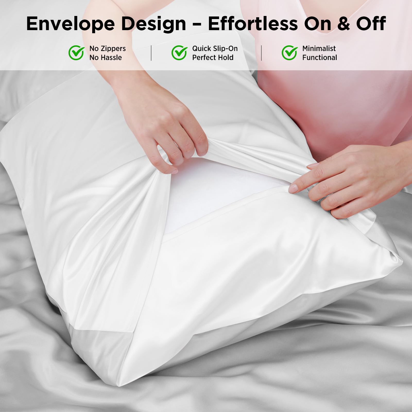 【Envelope Closure – Sleek & Secure】Thoughtfully designed with a minimalist envelope closure, this silk pillowcase stays in place all night — no zippers, no snags, no noise. Just effortless elegance and functionality.