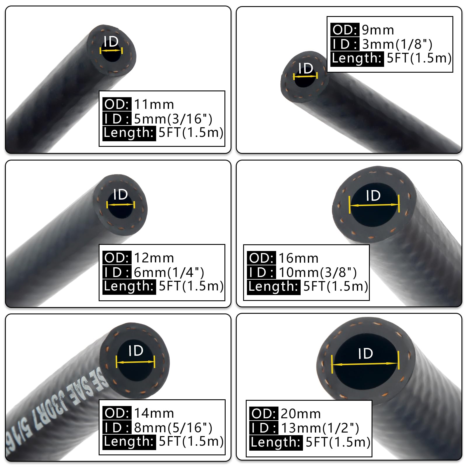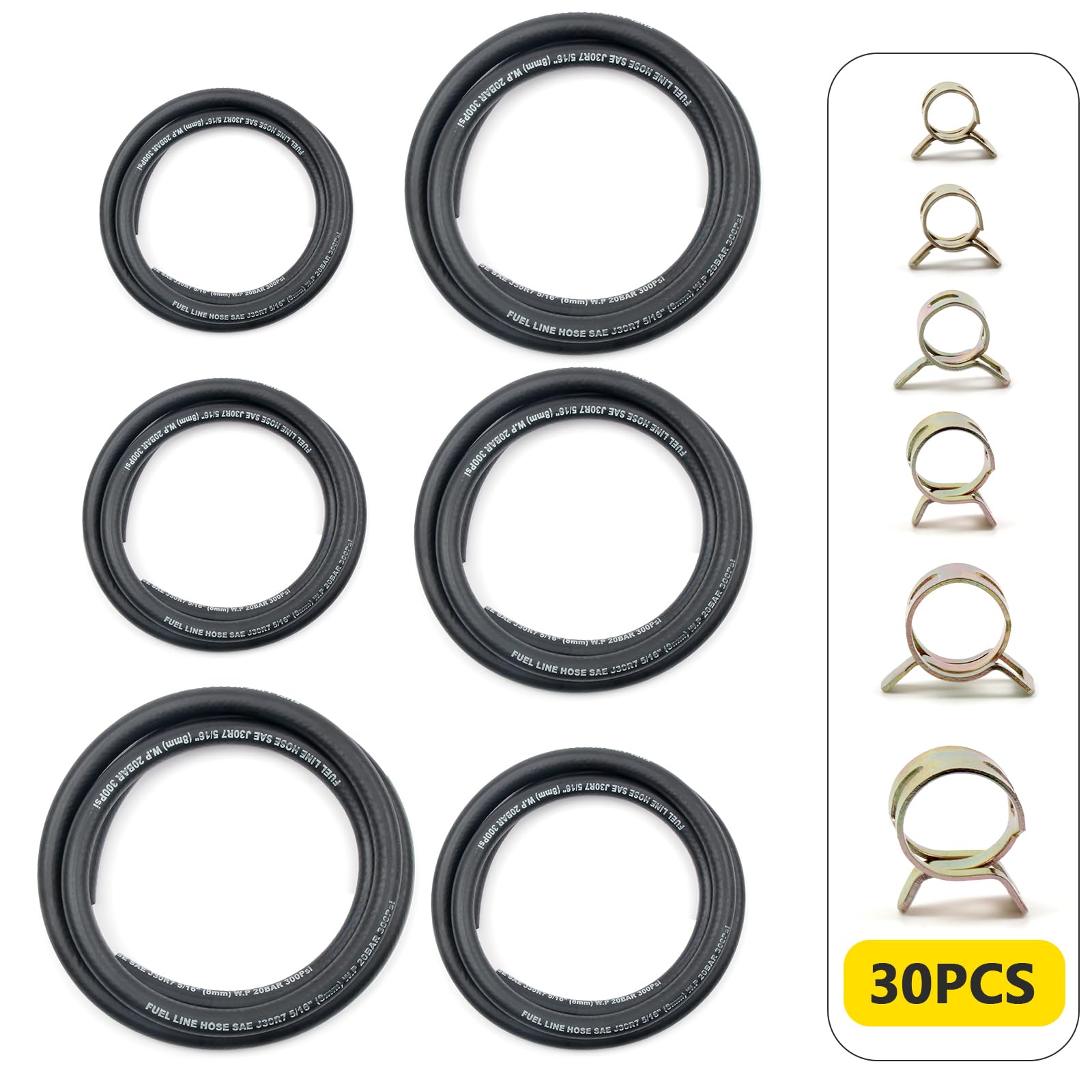 6 Size Fuel Line Hose Kit: This kit includes the most common hose size, 1/8" 3/8" 5/16" 1/4" 1/2" 3/16" 5FT with appropriate sized clamps 30pcs. A variety of fuel hose at the ready for times when you need them, enough variety and length for nearly any project