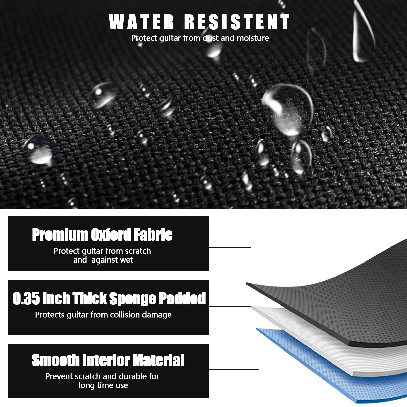 ♪ [Black Electric Guitar Bag] Black 600D textured oxford look with waterproof and cratch-resistant smooth lining and 0.35 Inch padding, easy to carry and avoid damage caused by bumps during transport.