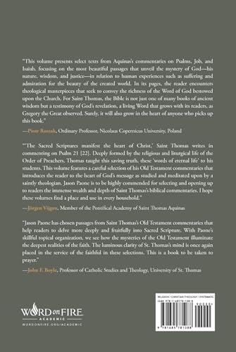 Thomas Aquinas’s Old Testament commentaries remain some of his most neglected writings due partly to the widely varying quality of both the commentaries themselves and their English translations, which often retain the terseness and opacity of the original Latin manuscripts. Nevertheless, Thomas’s corpus of Old Testament commentaries contains some of his finest biblical exegesis and theology. Within them, we find dimensions of his thought and literary personality that do not appear in any of his other writings. This volume aims to promote appreciation for Thomas’s Old Testament exegesis by making his best commentaries more accessible. To this end, it offers a topically organized selection of the most theologically profound lectures from his premier Old Testament commentaries—those on the Psalms, Job, and Isaiah. Moreover, the translations used in this collection have undergone extensive editing and revision to enhance their accuracy, elegance, clarity, stylistic consistency, and overall readability. Lastly, hundreds of explanatory footnotes have been added to facilitate study, along with two indices and a bibliography. Together with its companion volume, Thomas Aquinas: Selected Commentaries on the New Testament, this collection offers a curated introduction to Thomas’s biblical commentaries, suitable for newcomers, students, and scholars alike.