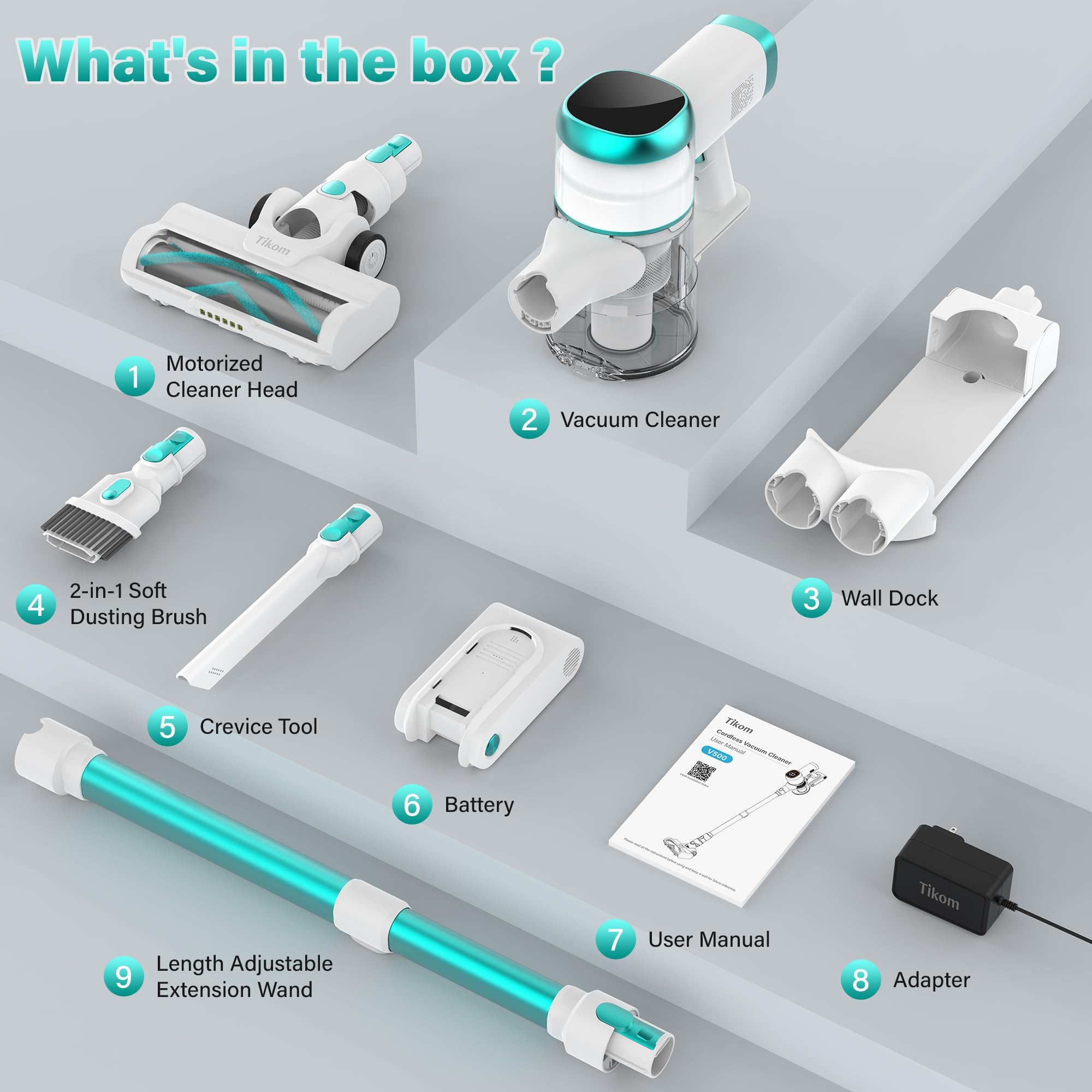 450W/40Kpa Powerful Suction: Tikom V500 Cordless Stick Vacuum Cleaner is equipped with a high-performance 450W motor, delivering up to 40Kpa suction power. The stick vacuum effortlessly handles pet hair, dog food crumbs, cat litter, and other debris, making it ideal for homes with pets
