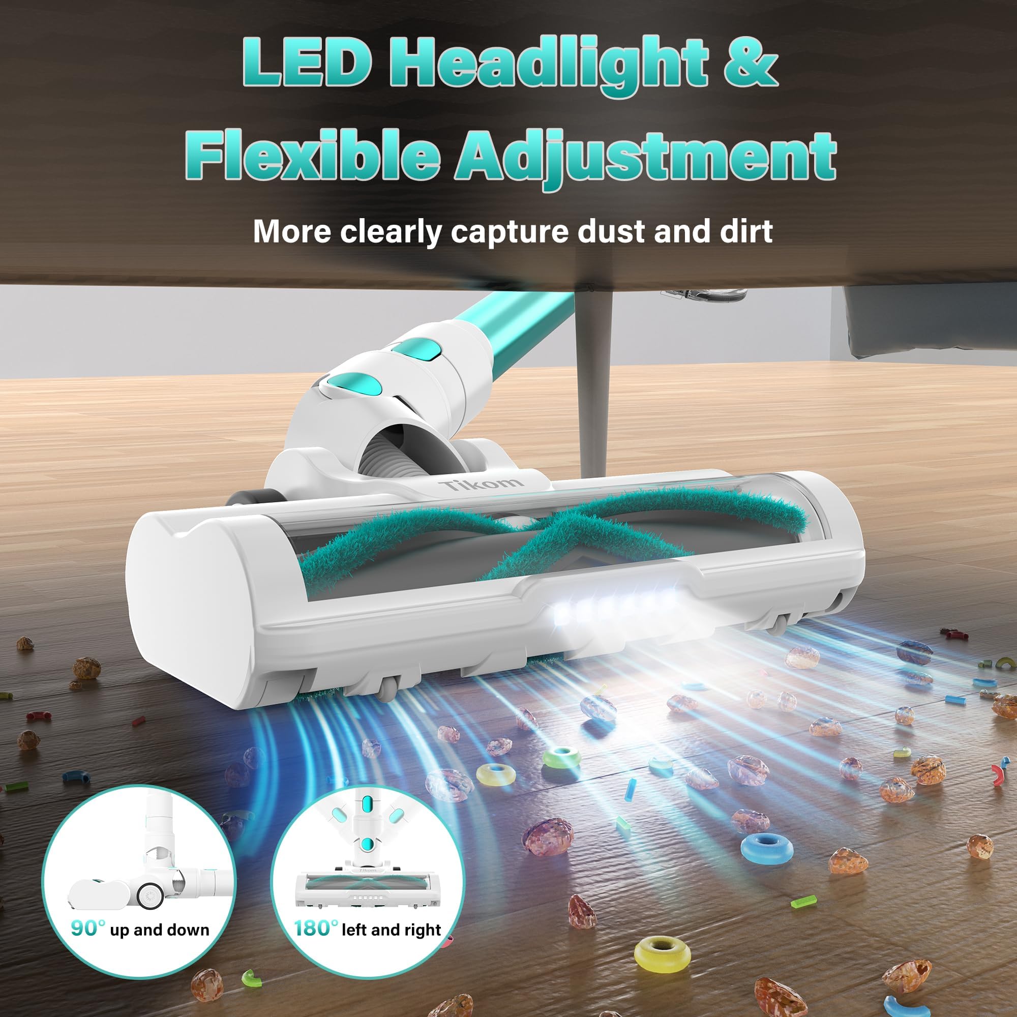 Maneuverability & LED Headlight: The stick vacuum cleaner offers 90° vertical and 180° horizontal rotation, making it easy to navigate around furniture and clean hard-to-reach areas. 6 LED headlights illuminate dark corners and reveal hidden dust, ensuring every spot is spotless