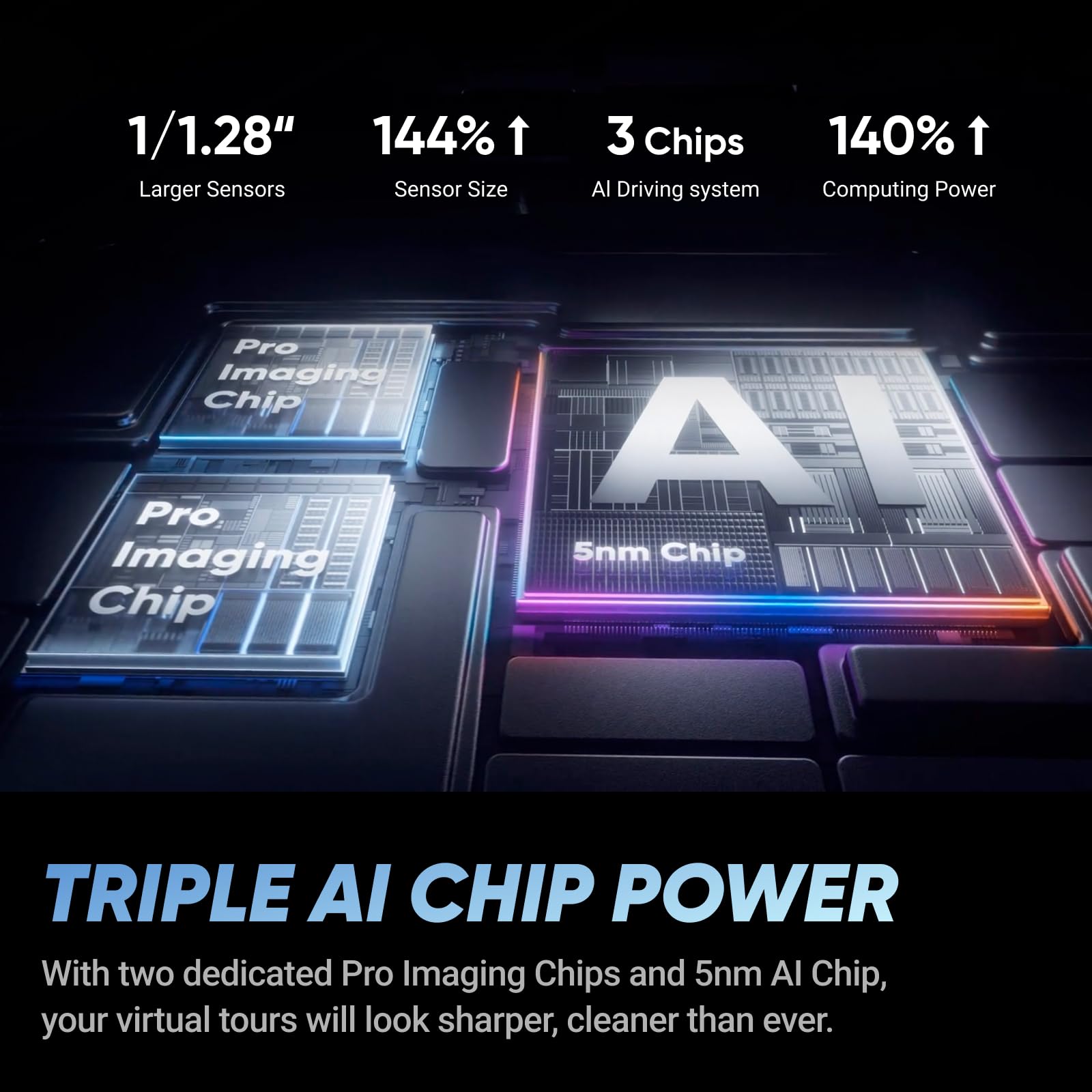 Bigger Sensor, Better Clarity: Capture 72MP 360 photos, 8K video, and stunning timelapses with large 1/1.28” sensors and a 5nm AI chip & two Pre Imgaing Chips ensuring cleaner, sharper images.