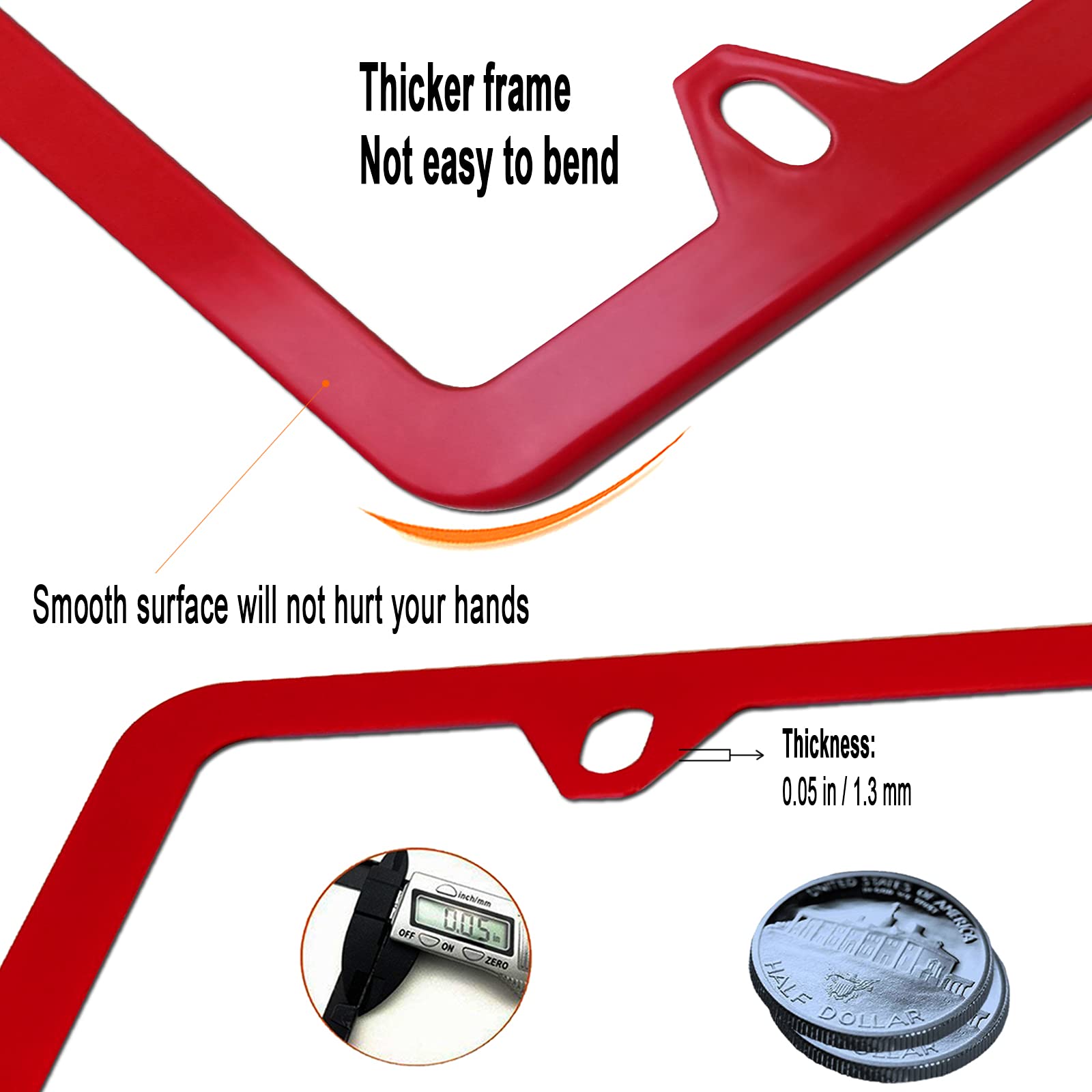 Universal Slim Car Plate Frame: The red holder uses an aluminum base frame, 1.3mm thick, heavy duty, and will not rust or corrode. Designed for all American 12*6 inch standard license plates, 4 thin edges will not Cover the registration label on the car tag, ensure legal street in all states.