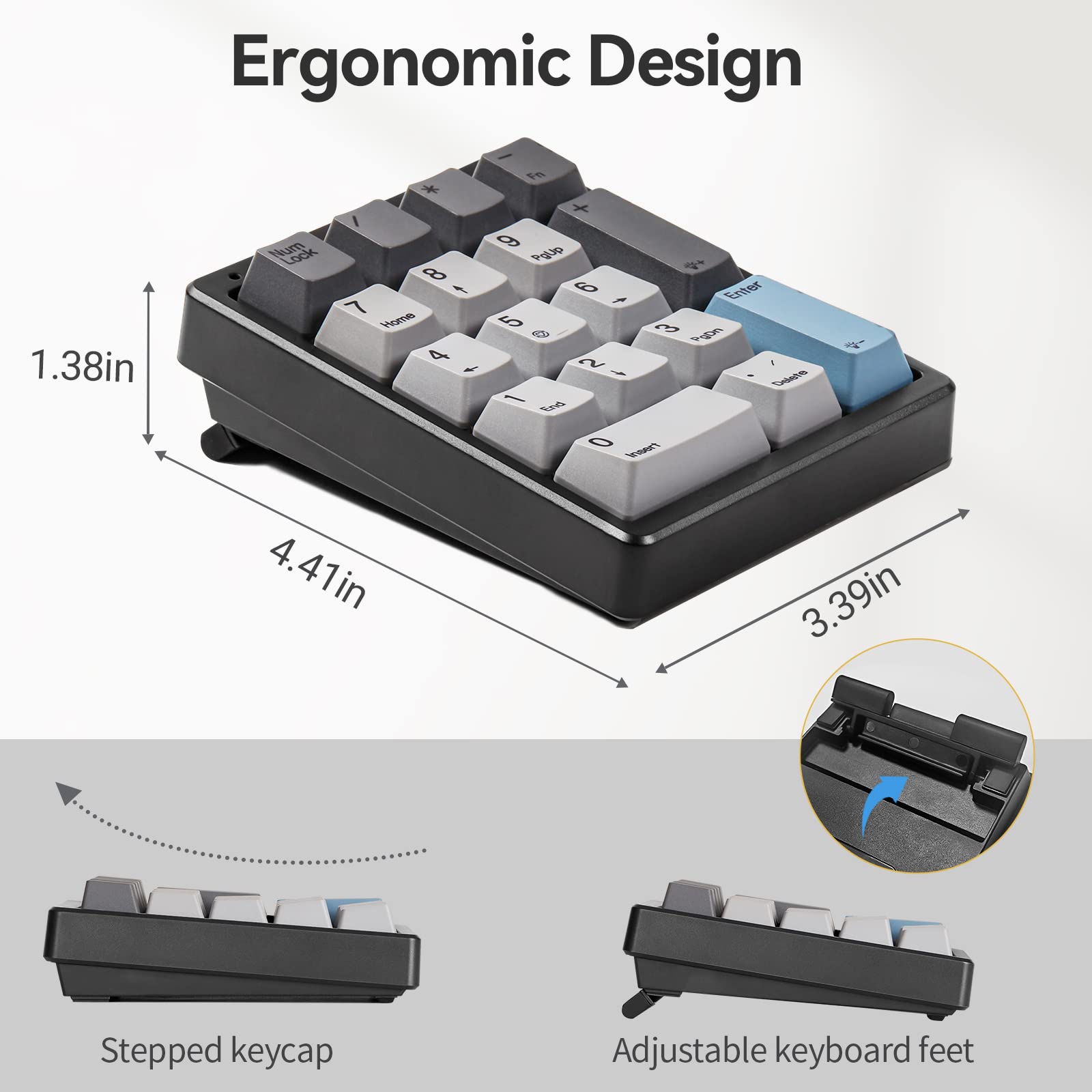 【Ergonomic Design】The stepped keycap and adjustable kickstand provide you with an ergonomic typing experience.Fit your hands easily and relieve fatigue of your wrist. Our number pad also as a great accessory for small laptops without a separate keypad.Unlike a traditional membrane number keypad for laptop,the Kisnt keypad is higher off the desk than the low profile keyboards most business computers come with.If you are sensitive to height, please check our height information carefully.
