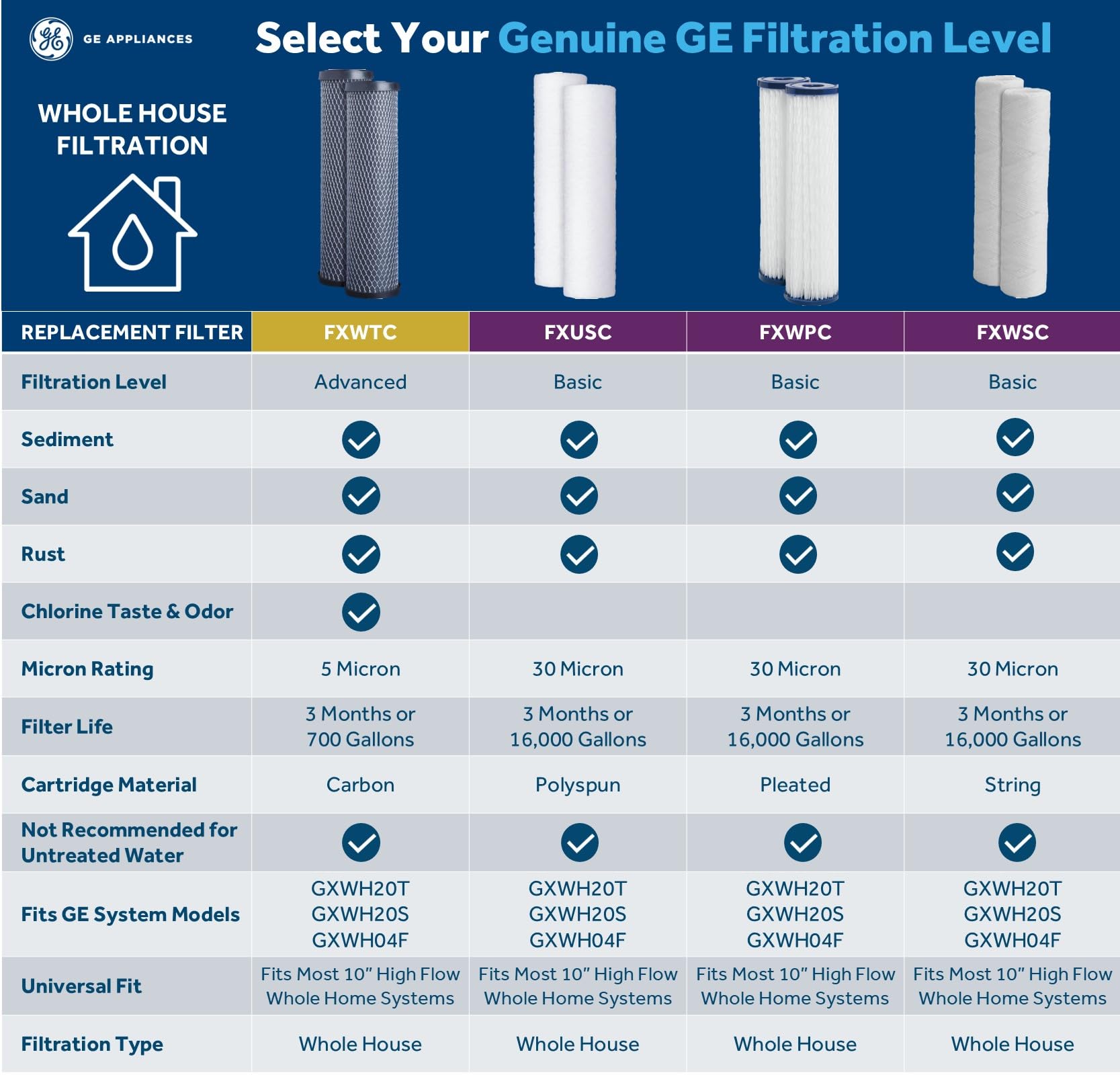 Product Description GE FXUSC Whole Home System Replacement Filter Reduces sand, sediment and rust. These filters are compatible with GE Household Filtration System models GXWH04 and GXWH20. Fits most major brands of heavy duty household filter 10" x 2.5" sumps. From the Manufacturer The GE FXUSC SmartWater Household Sediment Filter Cartridge water filter 2-pack fits GE Smart Water household water filtration systems. This GE FXUSC Revision 2 model also fits any other brand of water filter housing that uses 9-3/4-Inch x 2-1/2-Inch filter cartridges. If you're currently using the FXWSC or FXWPC water filter, it might be best to switch to the FXUSC since it removes more impurities from your home's water. The GE SmartWater FXUSC fits any brand of whole house water filter system that uses standard 9-3/4 x 2-1/2 filter cartridges. GE Part Number: FXUSC (SmartWater) Filter Life: 3 months Capacity: 16000 gallons Micron Rating: 30 - 50 microns Filter Type: PolySpun Actual Size: 10 inches (length) x 2-1/2-Inches (diameter)