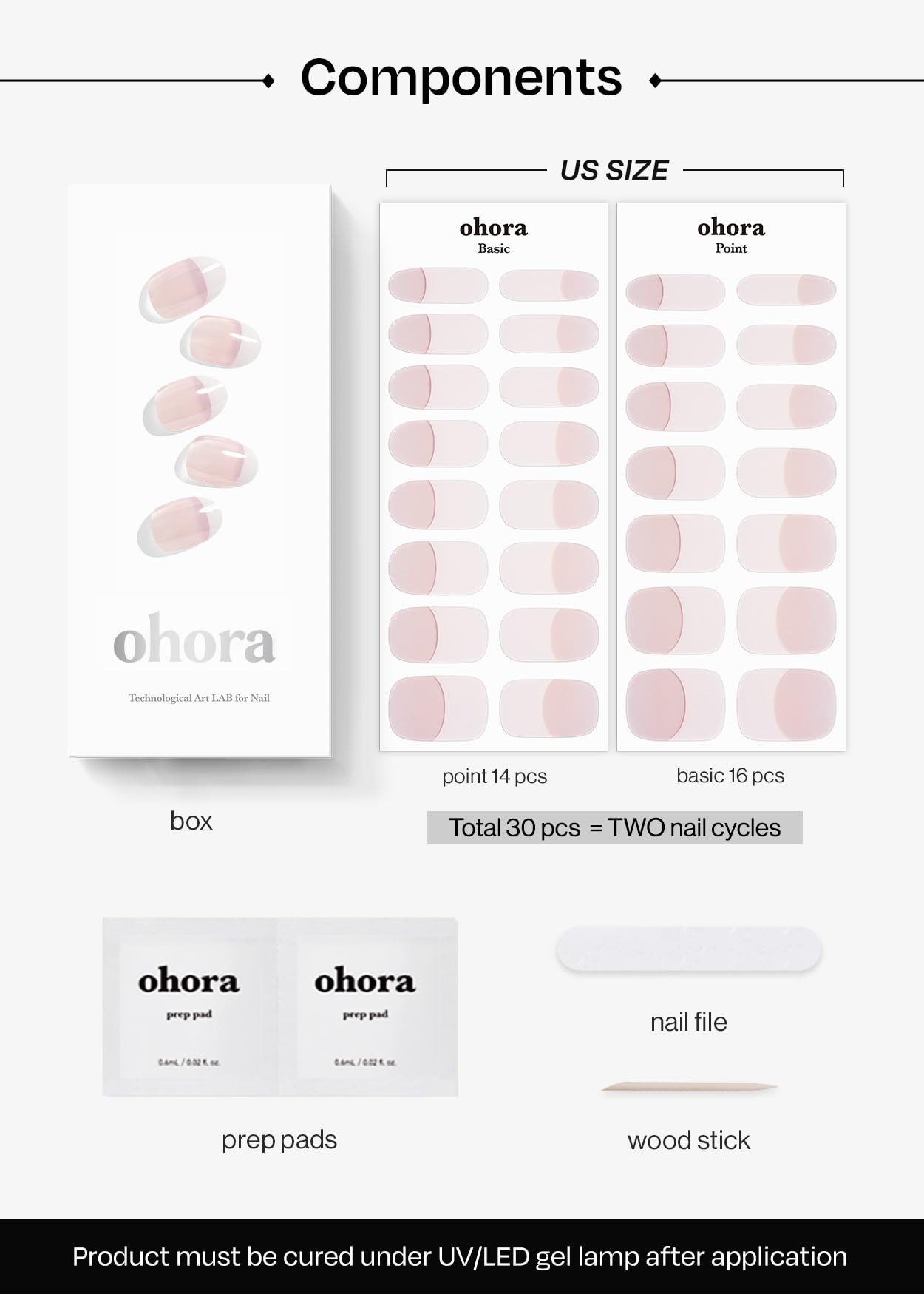 Complete Set of Nail Art Stickers - Each box includes 30 easy-to-use nail wraps (14 accent and 16 solid color) in 15 different sizes. It also comes with 2 prep pads, 1 nail file, and 1 wooden stick.