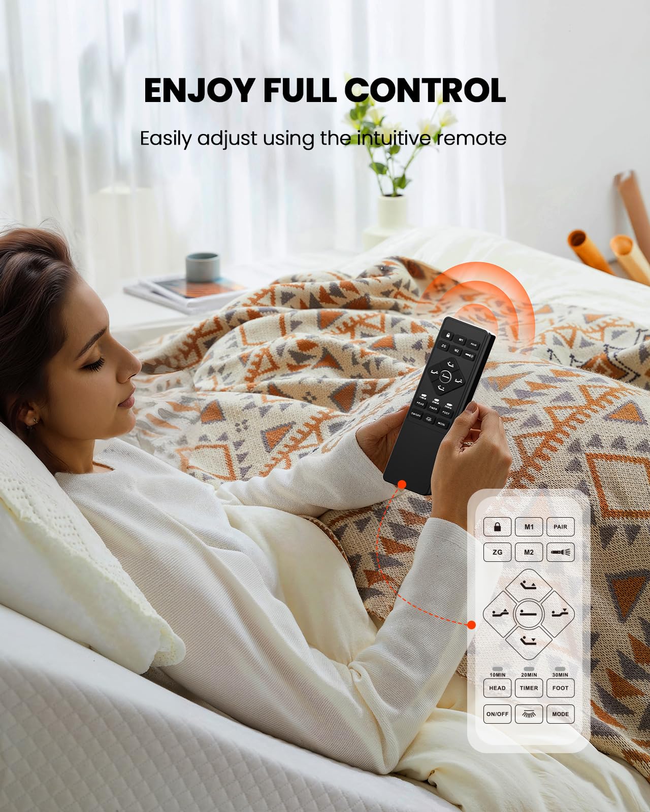 Relaxing Massage Feature: Experience soothing comfort with this adjustable bed thanks to head and foot massage options. With three intensity levels and four modes, you can target specific areas to relieve muscle tension, reduce stress, and promote better circulation—all controlled via the included remote.