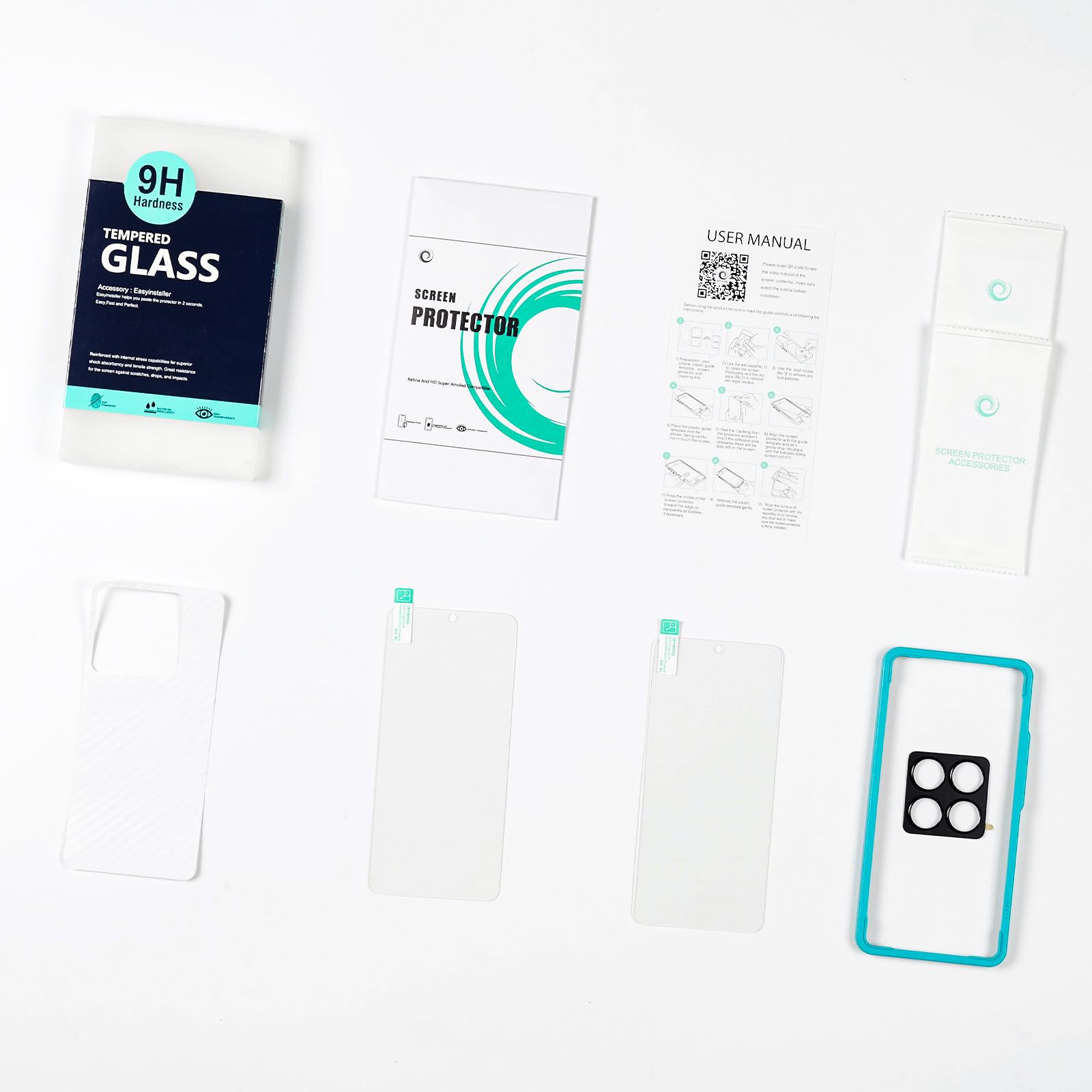 [Package Including]2Pcs Tempered Glass screen protector;1Pc Metal Camera Lens Protector("Hollow out" design);1Pc Back Carbon Fiber Skin Protector(transparet color);1Pc Easy Installation Frame; 2packs installation accessory kits,1Pc Installation Instructions