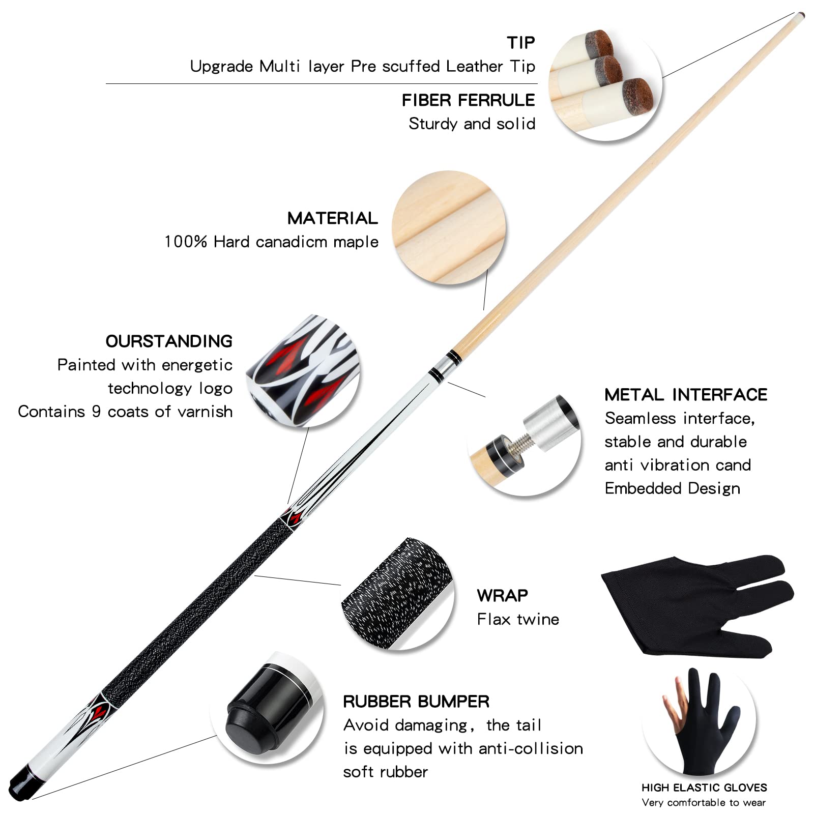 Package: Includes 1 PCS of 58 Inch pool cue, 1 glove, 1 high quality leatherette cue bag.