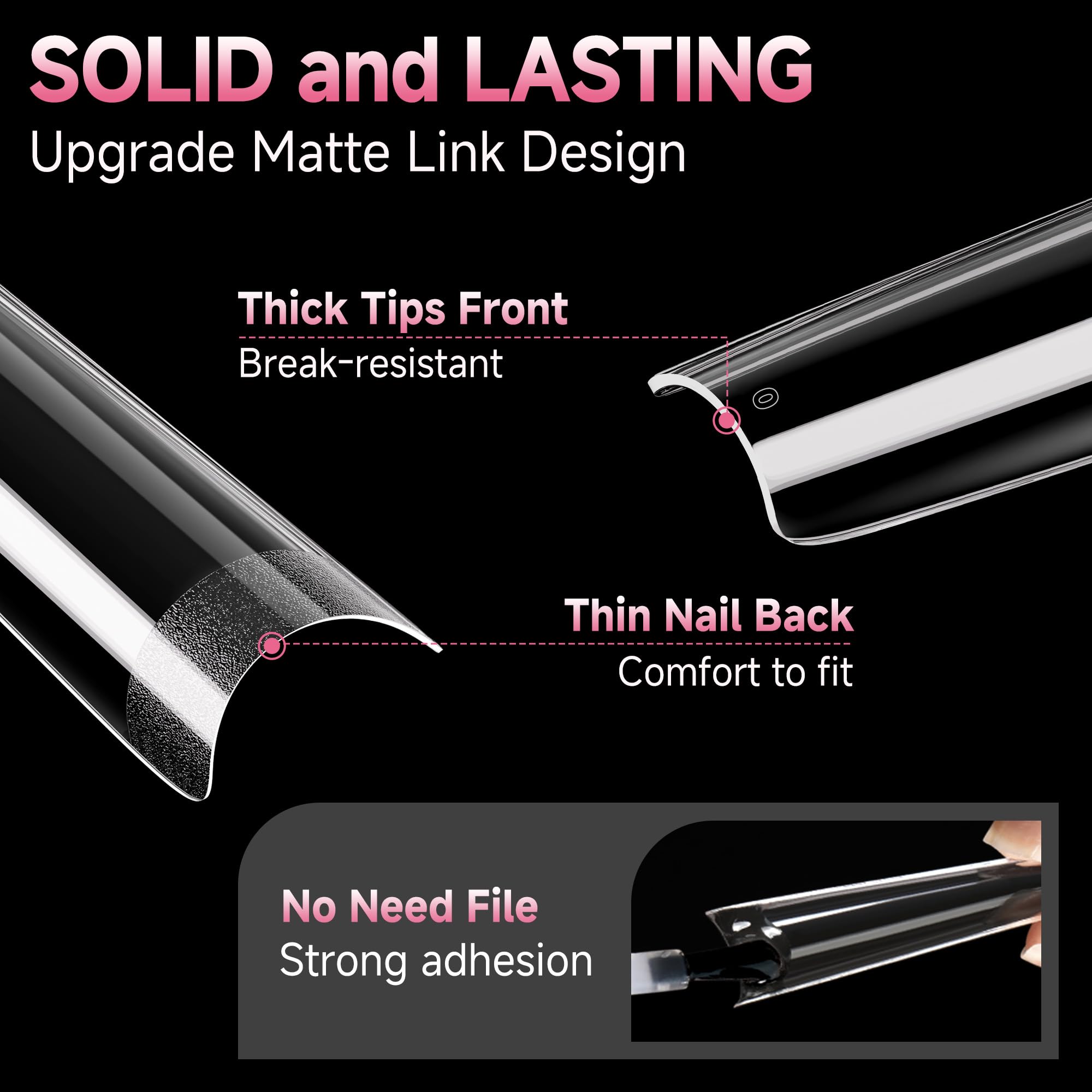 ❤️Easy to Use: Our xxl coffin gel nail tips smooth edge of tips have a more shallow curve, update no c curve design convenient to press on nails beds tightly, without feeling uncomfortable "tightness". Extra matte link for better adhesion and no need file! Clear nails cover on your nails will look more naturally. It makes enjoying your manicure experience more time-efficient.