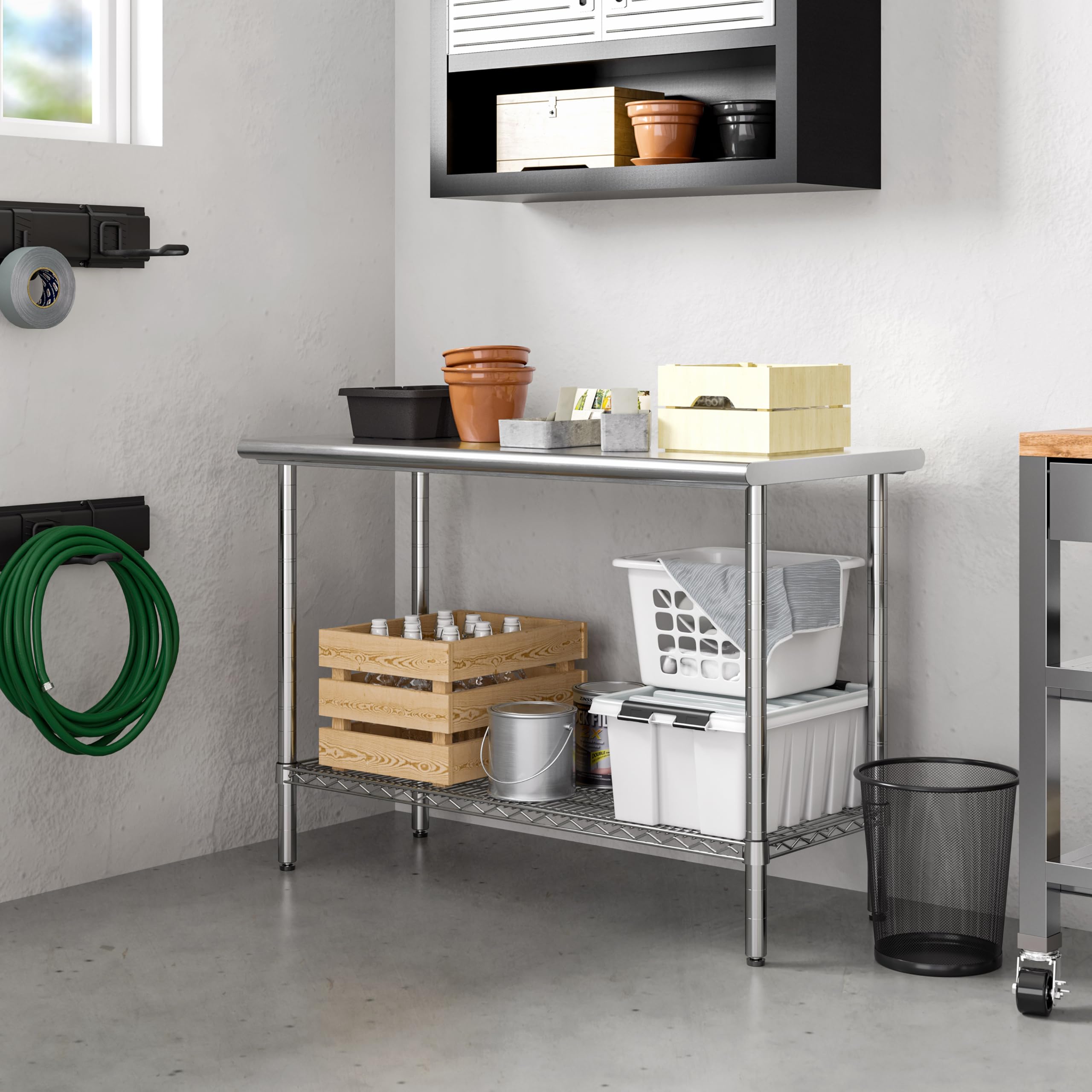 Make the most of your workspace with Seville Classics multifunctional and versatile Commercial NSF Stainless Steel Top Worktable. The table top features a thick, heavy-duty stainless-steel work surface. Table features a rounded bullnose edge for extra safety. Built with industrial-strength steel, the frame is engineered for strength and durability and is protected with a chrome coat. Designed for multifunctional use, the top measures 2 feet by 4 feet (24" x 49"); making it ideal for use in the home, garages, workshops, offices, laundry rooms, bedrooms and kitchens. A ventilated steel wire shelf below can be adjusted by 1-inch increments to your desired height and can store up to 500 lbs.; unit supports up to 1000 lbs. total. Brushed 443 stainless steel table top with bullnose edge Includes steel wire shelf adjustable at 1-inch increments Worktable hold up to 500 lbs. per shelf; up to 1000 lbs. total Chrome plated steel legs with leveling feet; easy to wipe clean with soap and water Easy assembly; ideal for commercial, home and office environments Specifications Dimensions: 24" D x 49" W x 35.5" H Weight Capacity: 1000 lbs. Weight: 55 lbs. Model #: SHE18308B Limited 1-Year Manufacturer's Warranty Seville Classics products are backed by a 1-year limited warranty unless otherwise specified. The warranty protects against original defects in material or workmanship under normal home or office use for the duration of the warranty period.