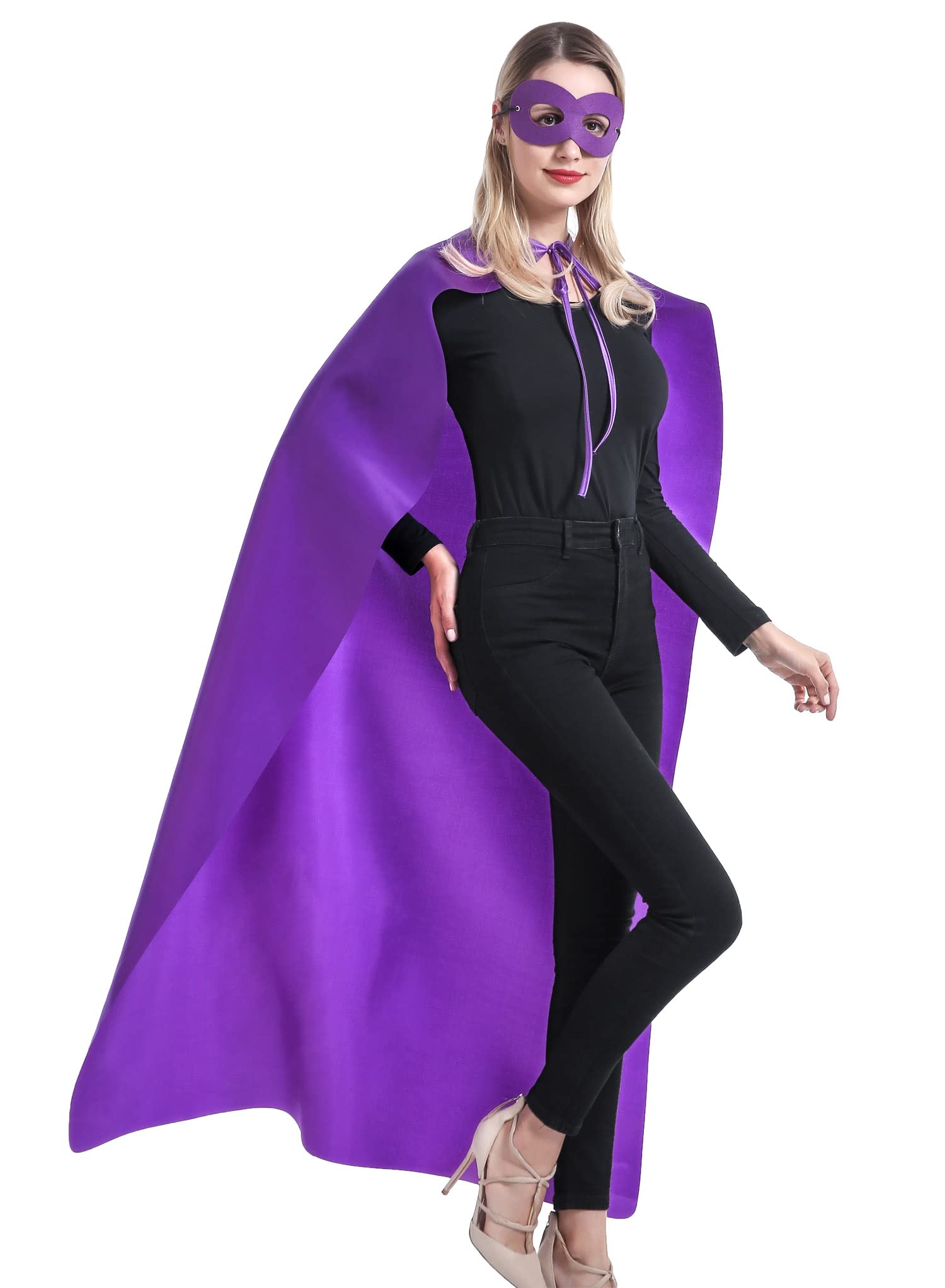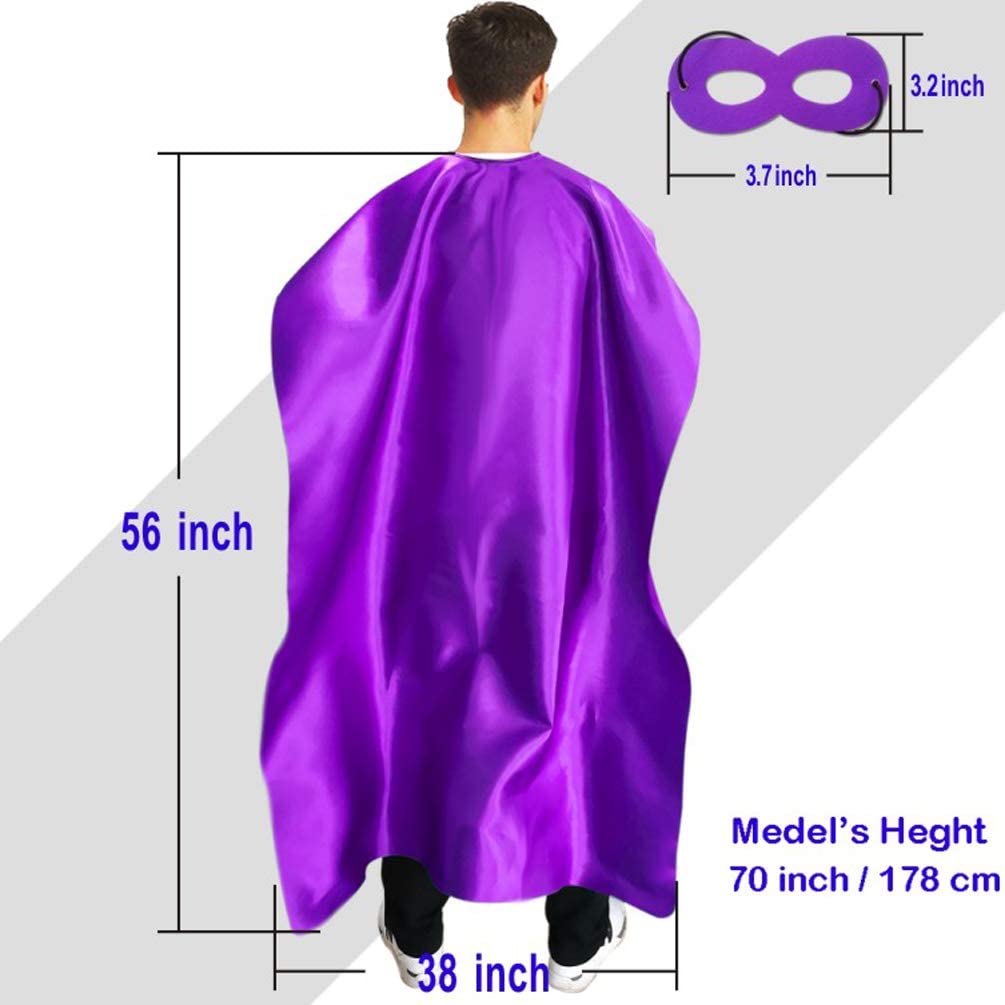 Size:Length 57 x Width 38 inch for capes. Our superhero capes and masks for adult bulk pack, are designed in perfect size after plenty of test; We have round neck hole, which fits better than simply sewed straight fabric with elastic. You can tie a bow with the cord to fit the neck. The masks ensure a snug with elastic but not too tight fit.