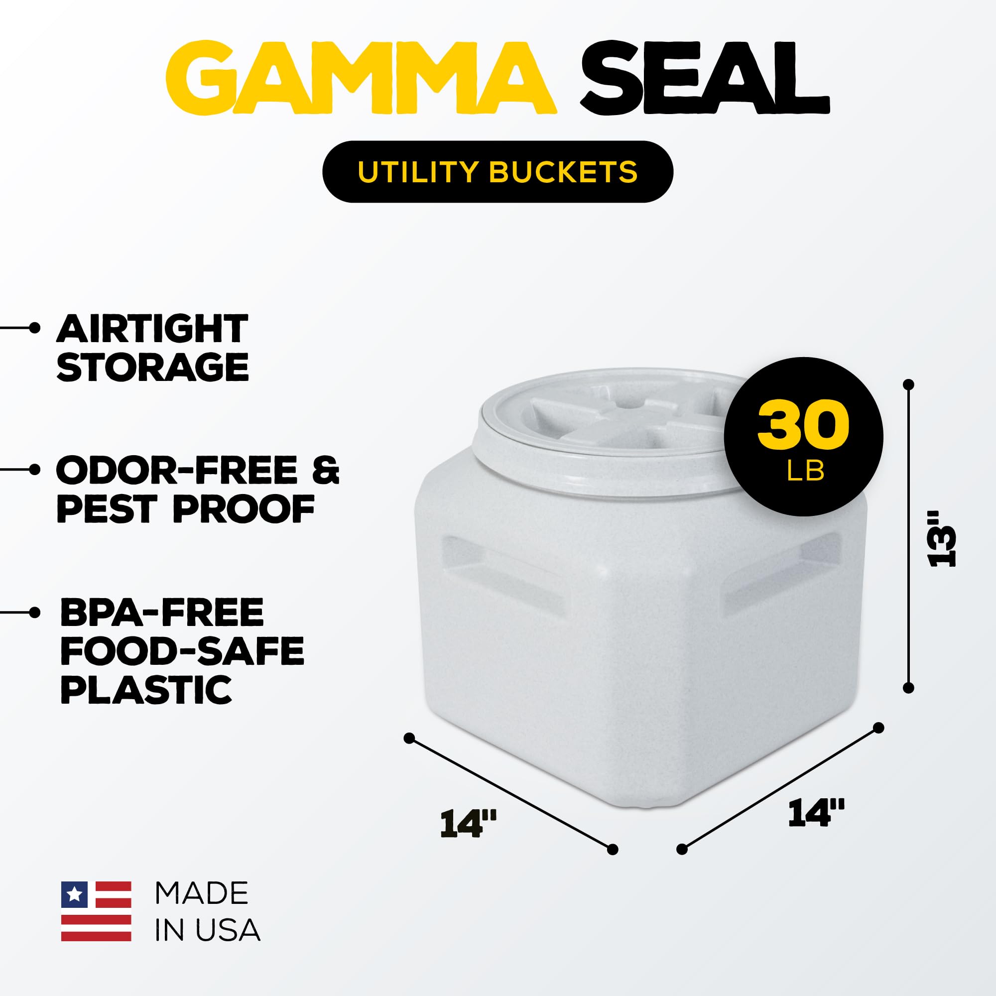 Keep your pet’s food fresh and flavorful with our sealed dog food storage container, designed to hold up to 30 pounds of pet food. Made from HDPE plastic, this durable cat and dog food storage solution is a great choice for maintaining the quality of your pet's kibble. Its Gamma Seal Technology utilizes a threaded locking system and double gaskets, providing a controlled moisture balance while keeping pesky pests at bay. This animal food storage container is suitable for a variety of dry foods, including birdseed and goat feed. Our pet food storage bins are engineered to last, resisting shattering and cracking for indoor or covered outdoor use, although climate-controlled storage is recommended. Choose the appropriate size to accommodate your pet's kibble shape and density, and when uncertain, it's best to round up to the next available size, for a large dog food container. Only our 40-pound and 60-pound plastic storage containers are stackable, offering you flexibility in your closet organizers and storage. Proudly made in the USA, these storage containers are crafted by Gamma2.