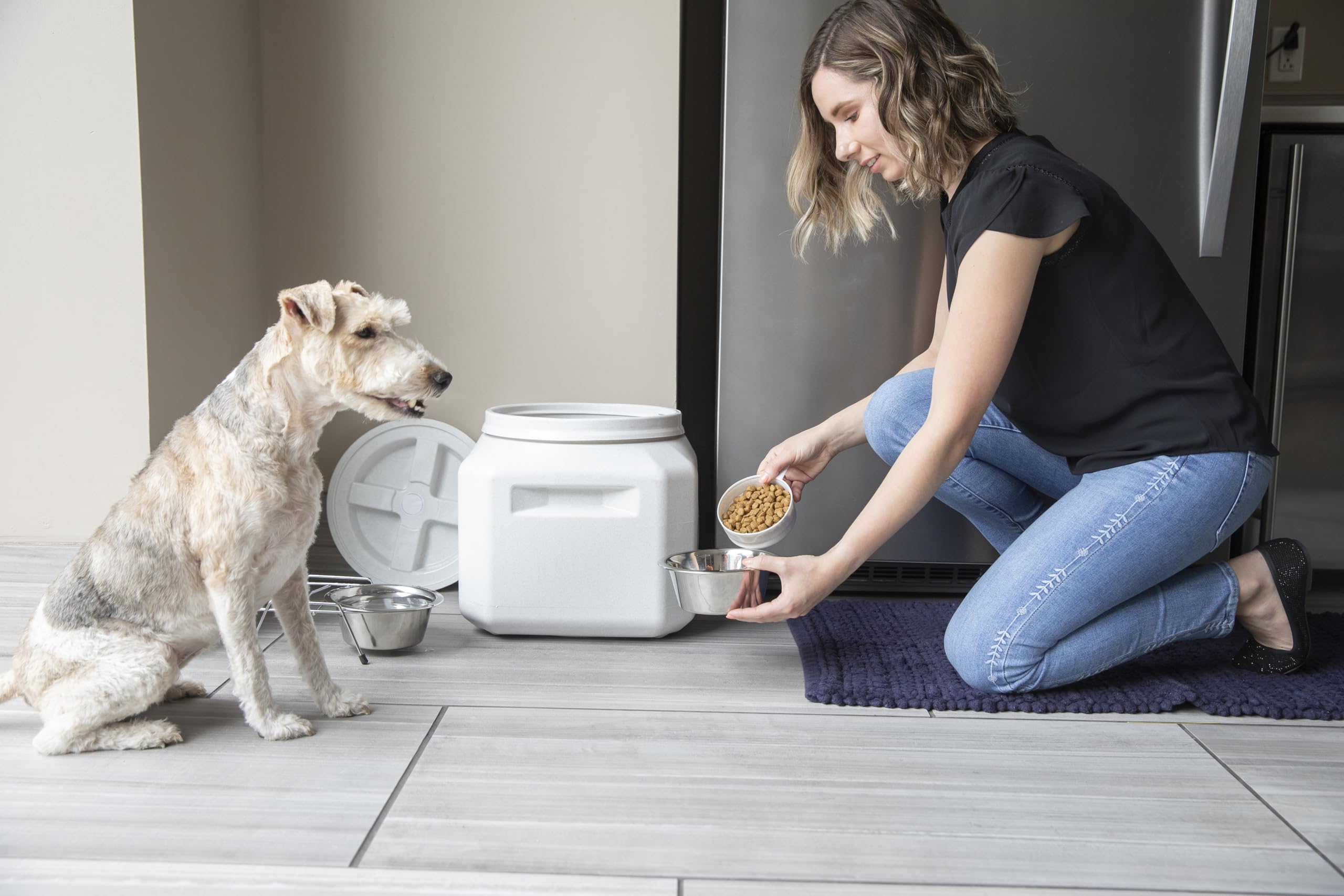 STORAGE CAPACITY: Choose the right size dog food container based on your pet's kibble shape and density; for larger kibble, opt for a large dog food storage container that is one of two sizes larger than the weight of the pet food
