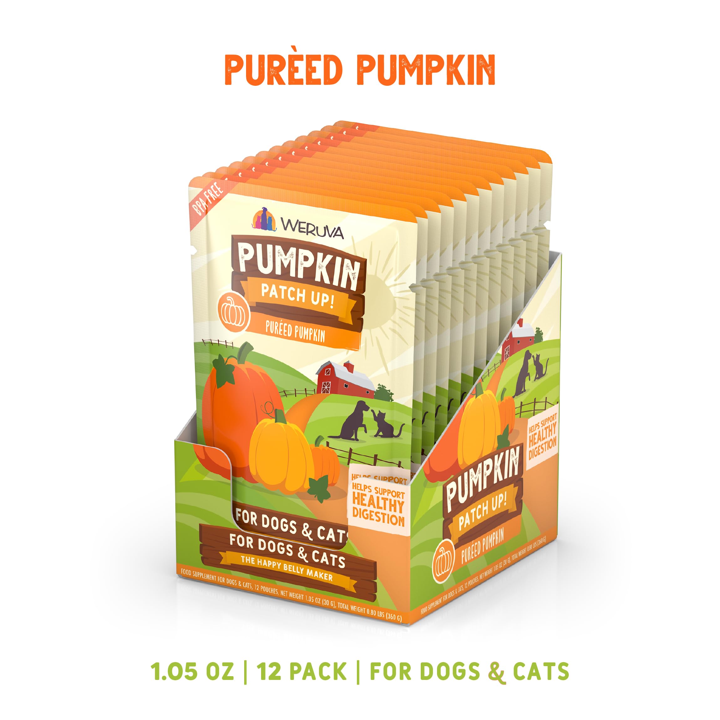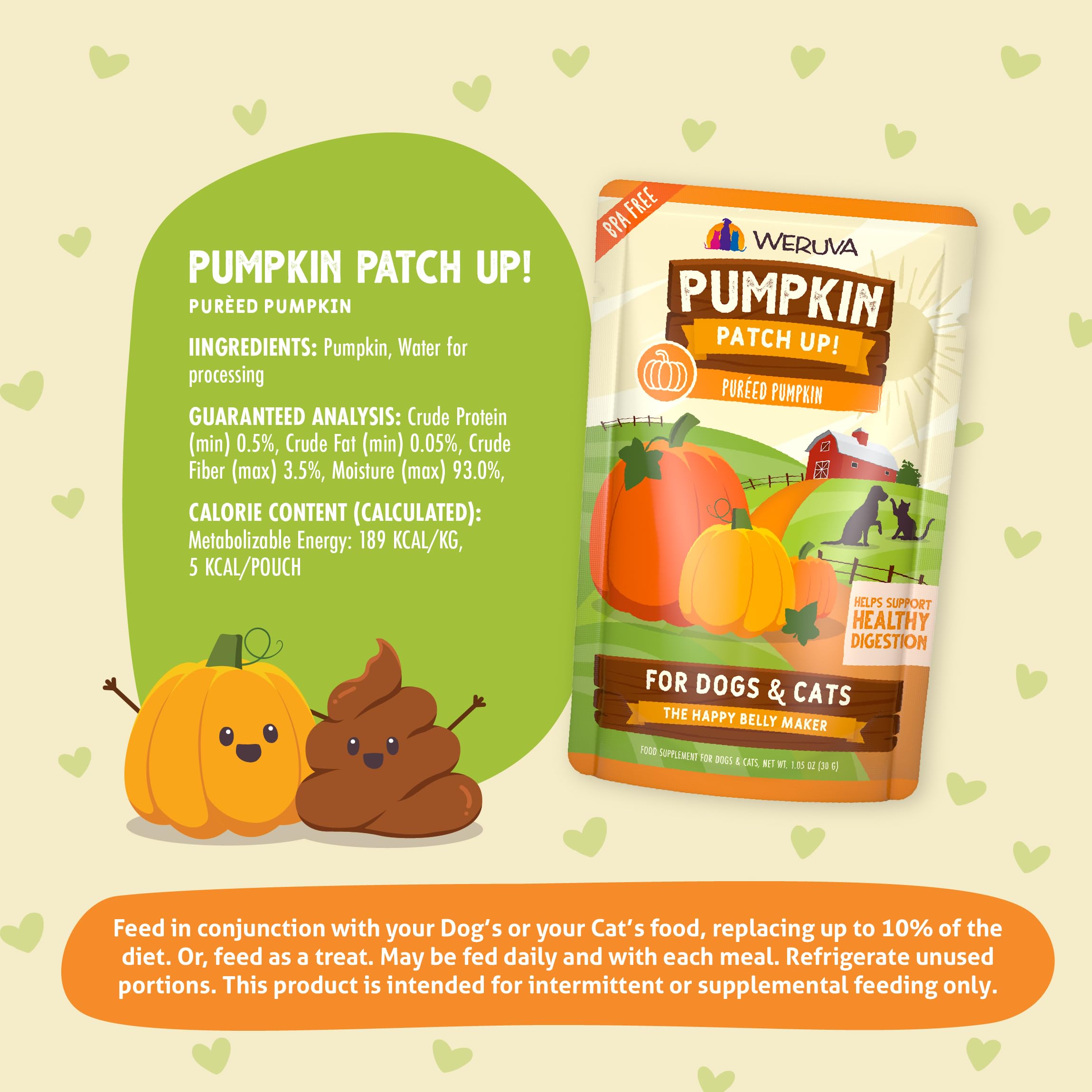 Meet Weruva, Makers of Pumpkin Patch Up!: Weruva was founded over ten years ago by David & Stacie Forman and is still proud be family owned and operated. WeRuVa was inspired by and named after the founders three rescued cats; Webster, Rudi and Vanessa. With the search for The Best Cat Food Under the Sun never seeming to end, David & Stacie thought, Lets give it a shot ourselves and gathered the best ingredients from around the world, formulated some fantastic recipes and created Weruva. Naturally, when they were lucky enough to have their rescued dog Baron enter the family, they decided to expand our products to include dog food. Our desire for more innovative, healthy pet products could not be stopped and we continued to dream up and produce some of the best products for pets and their people. Today, we have expanded our product offerings to include four cat wet food brands, two dog wet food brands, dry dog food, treats, pumpkin supplements and even litter! Quality Control, Safety & Ingredients: Weruva always strives to be more than just a pet food company. We are obsessive over Safety and Quality Control and only produce our products in BRC/USDA Approved Facilities; arguably the highest standards for human-food production. We also source responsible and sustainable raw materials. Learn About Pumpkin Patch Up!: Pumpkin is a great source of healthy fiber to support your cats and dogs digestive system. It supports stool quality, contains soluble and insoluble fiber, supports gut motility and is pureed for easy mixing. Contains no artificial ingredients, sweeteners, colors or flavors. Pureed for easy mixing with only two ingredients. Gluten-Free, GMO-Free and BPA-Free. Pumpkin Patch Up! Supplement for cats and dogs is available in 1.05oz and 2.8oz easy-to-serve pouches.Guaranteed Analysis:Protein (min) 0.5%, Fat (min) 0.05%, Fiber (max) 1.0%, Moisture (max) 93%AAFCO Statement:Pumpkin Patch Up! Pumpkin for Dogs & Cats is intended for supplemental or intermittent feeding only.
