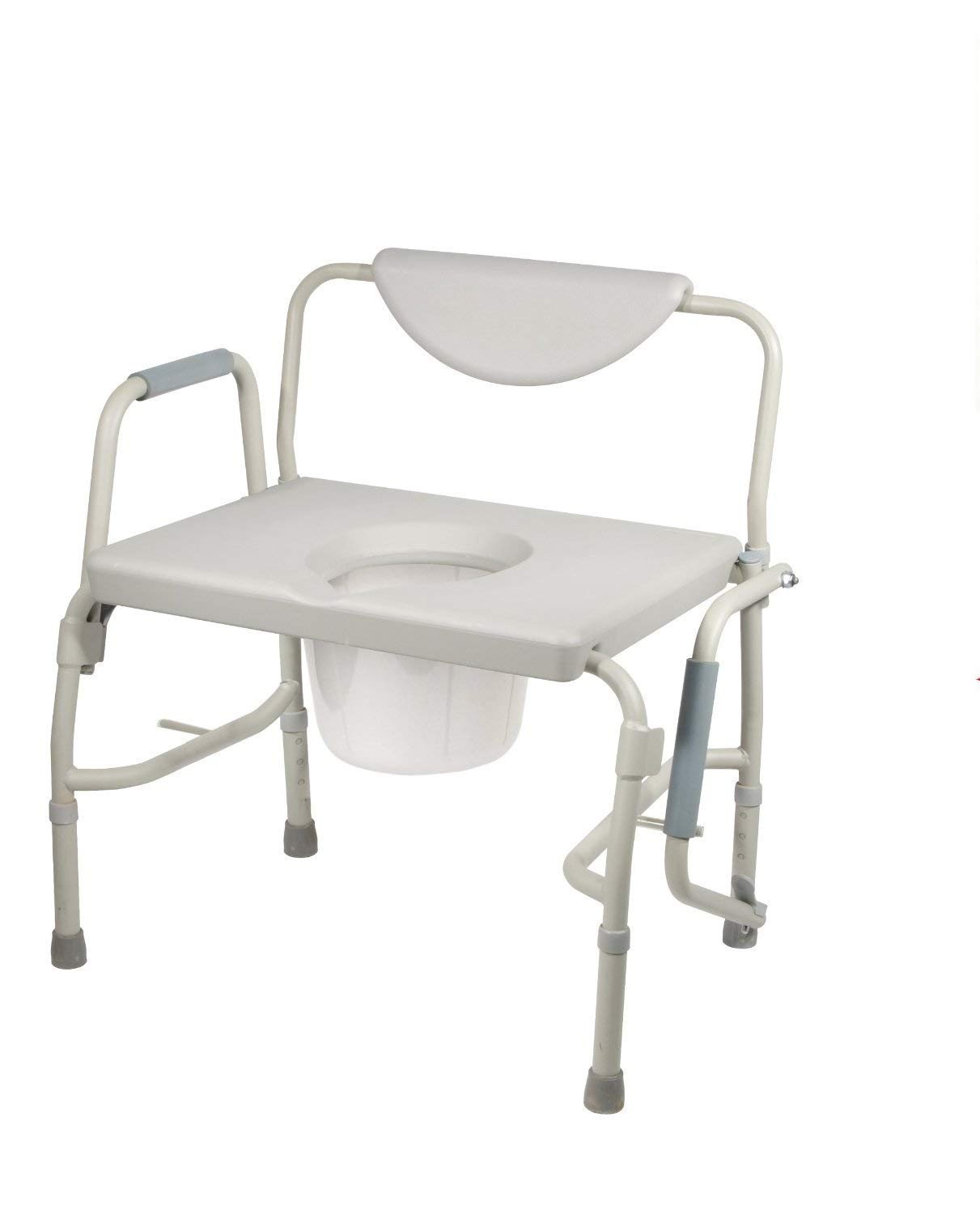 This heavy duty bedside commode chair from Healthline Trading has a convenient drop-arm design. It will be the perfect addition to your care routine for elderly or disabled persons. Lower the arms to make your patient more comfortable or to make transfer to and from the portable commode easier. The bariatric drop arm commode is lightweight and portable. It weighs only 19.84 lbs. The seat height can be adjusted from 19.5 inches to 23.5 inches. The seat surface size is 23.5 inches x 18.5 inches. Though lightweight, the commode toilet chair can hold up to 1000 lbs. This makes it a versatile option for persons of various sizes and weights. The drop arm bedside commode has several uses. It can also function as a toilet safety frame. It has its own bucket with lid, yet this can be removed and the seat frame can be placed over your existing toilet. This will make going to the bathroom easier and safer whether you are transporting your patient to the bathroom or keeping the commode at their bedside.