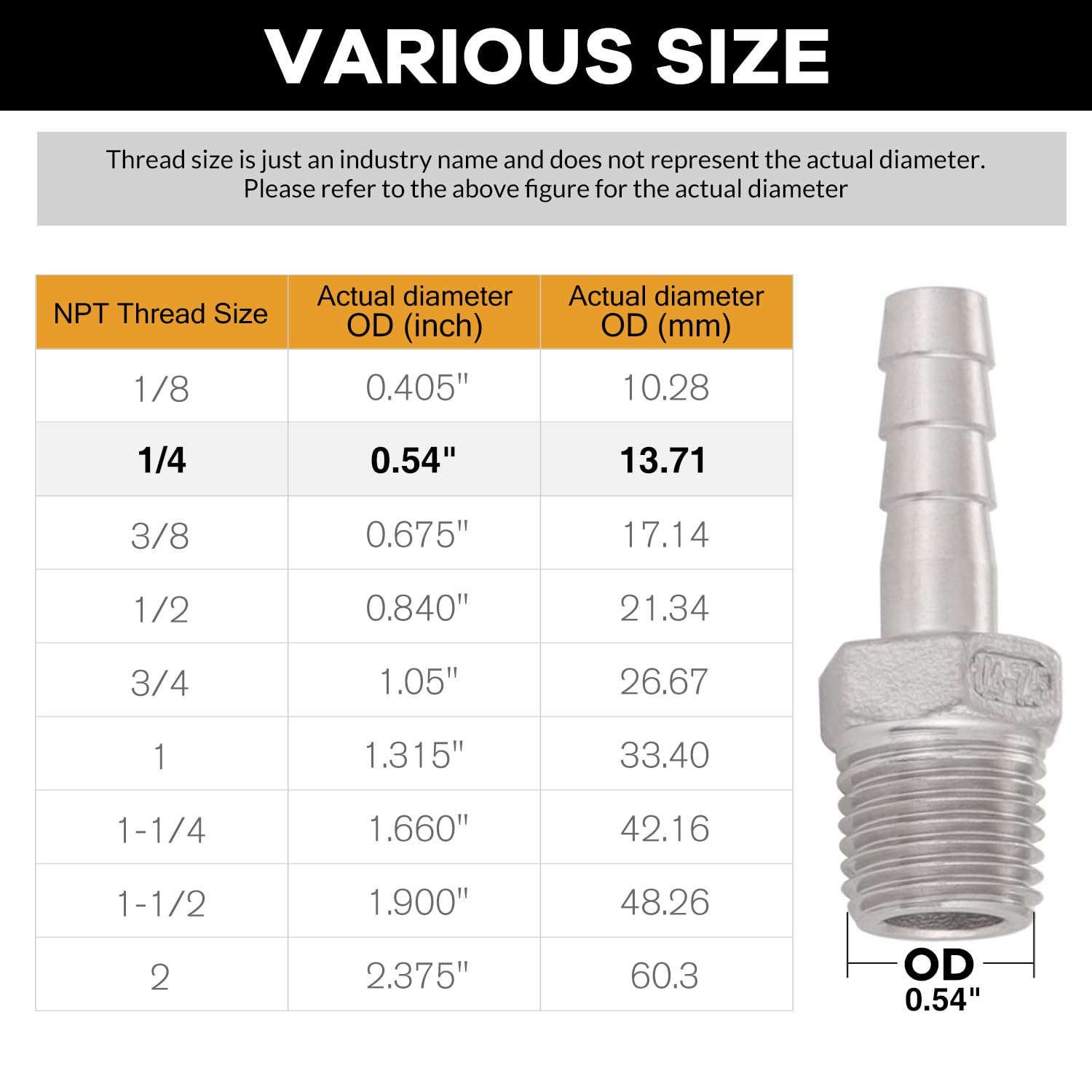 Size: 3/8" barb (3/8 inch inner diameter hose) x 1/4" NPT (actual diameter of the thread is 0.54 inch) , there is a size chart in the link, please confirm before purchasing.
