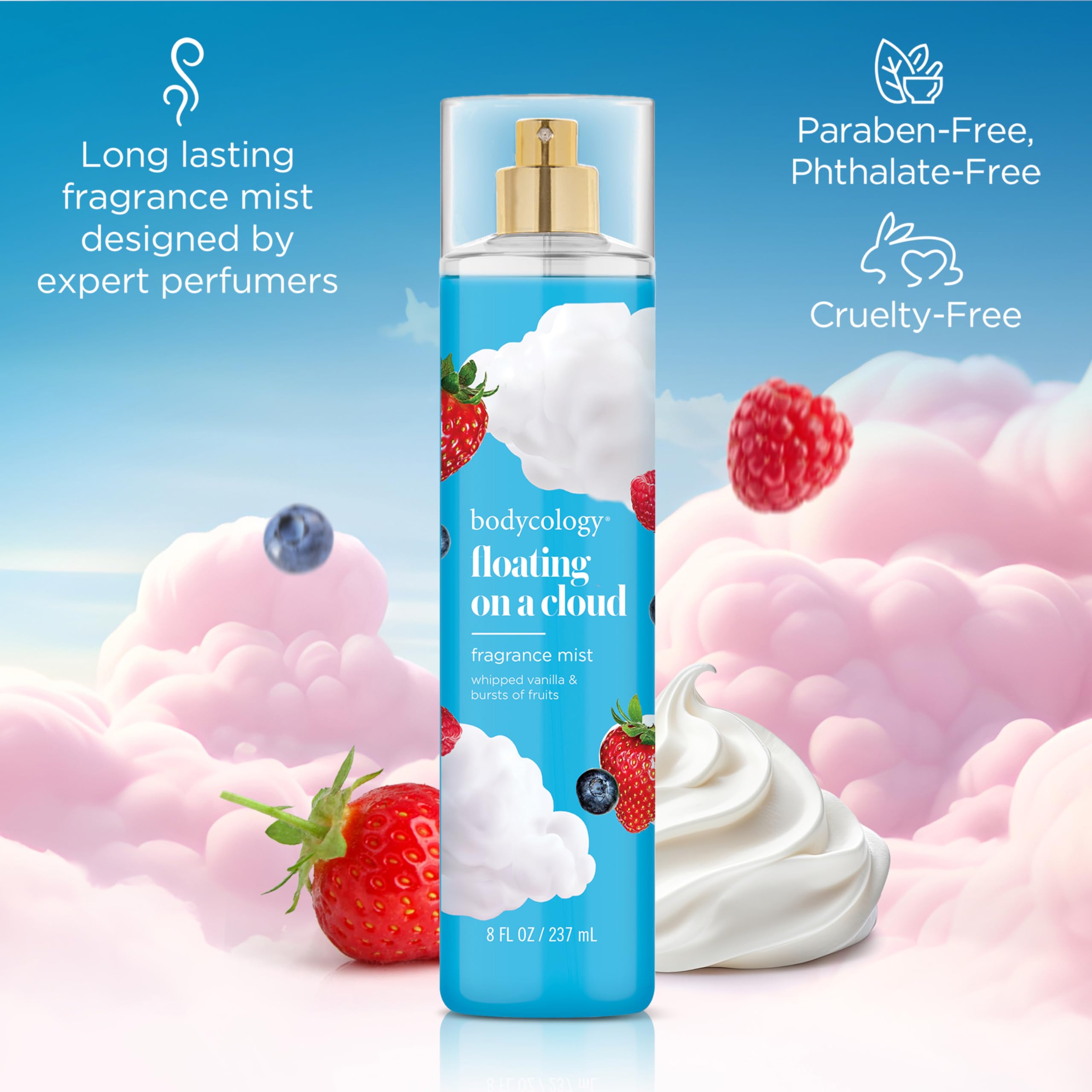 Feel relaxed and refreshed every time you wear Bodycology Floating on a Cloud Fragrance Body Mist. With just a spritz or two before your day begins, you can carry the dreamy blend of sweet berries, whipped vanilla, and sugared musk with you for hours. Fruity, and delightful, this fragrance captures the essence of floating on a cloud. Spritz it on your wrists, neck, and or try spraying the mist into the air and allowing it to fall gently onto your skin. Luxurious and bright, this fragrance mist will quickly become a part of your beauty routine. This fragrance mist is the perfect follow-up after moisturizing with our Bodycology Floating on a Cloud Shea Butter Body Cream. Mix and match with our other fragrance mists to create a scent that is uniquely yours. All Bodycology products are paraben, phthalate, and cruelty-free.