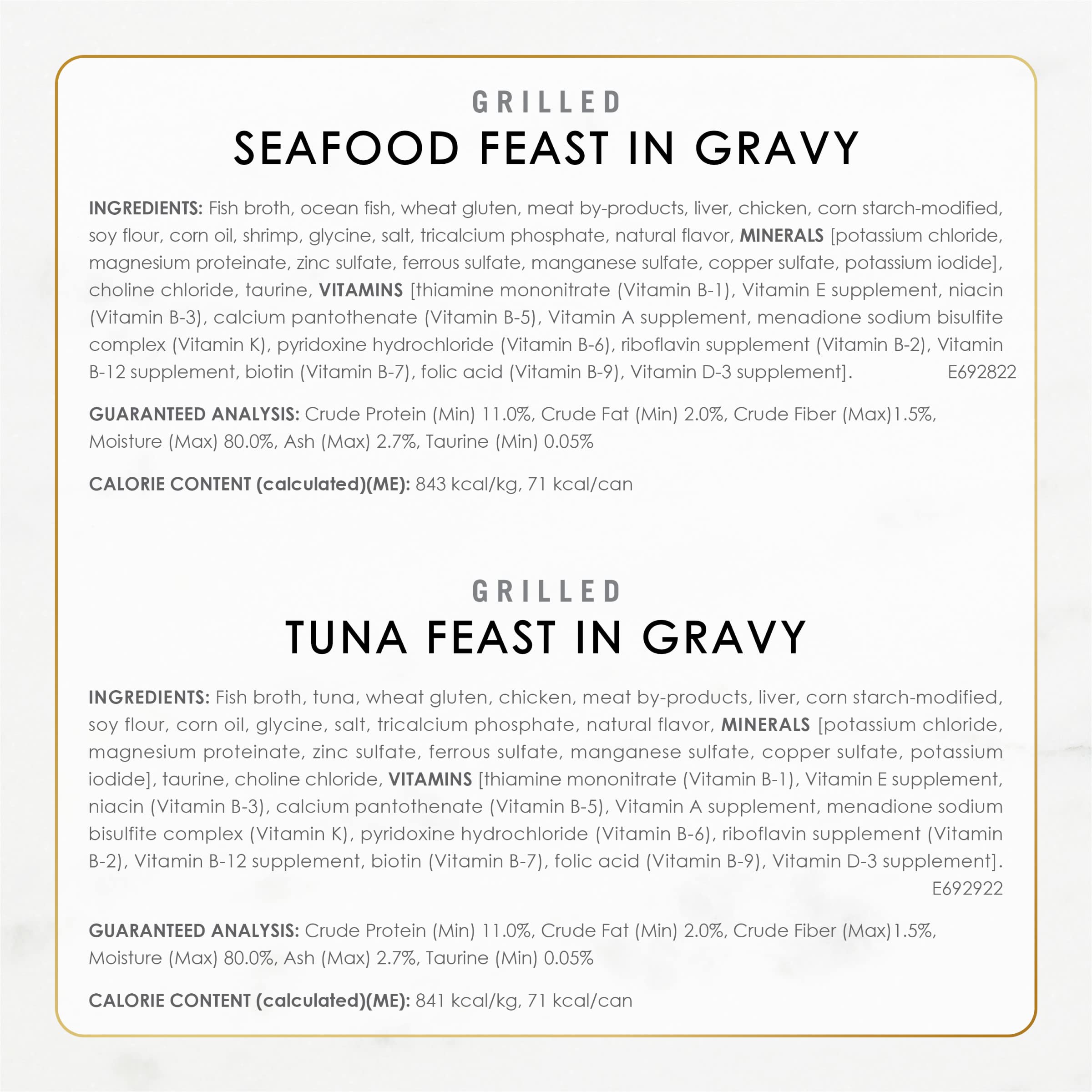 Make mealtime a memorable occasion when you serve Purina Fancy Feast Grilled Seafood Feast Collection wet cat food. Tender cuts of fish and seafood deliver the ocean flavors cats crave, and the tender texture of this soft cat food entices your cat to eat every scrumptious bite. Each recipe features a savory gravy that balances out these mouthwatering entrees, and high-quality ingredients provide an exceptional level of taste. With essential vitamins and minerals to support her overall health in every serving, this gourmet cat food lets you feel good about the meals you serve. Offer up a different recipe at every feeding to keep her interested in what's being put in her dish, and let her delight in the rich flavors. She is sure to love the gourmet flavor combinations, and you can rest easy knowing she's getting 100 percent complete and balanced nutrition for adult cats. Get her favorite soft cat food delivered with just a few mouse clicks when you order this Purina recipe from Amazon.com.