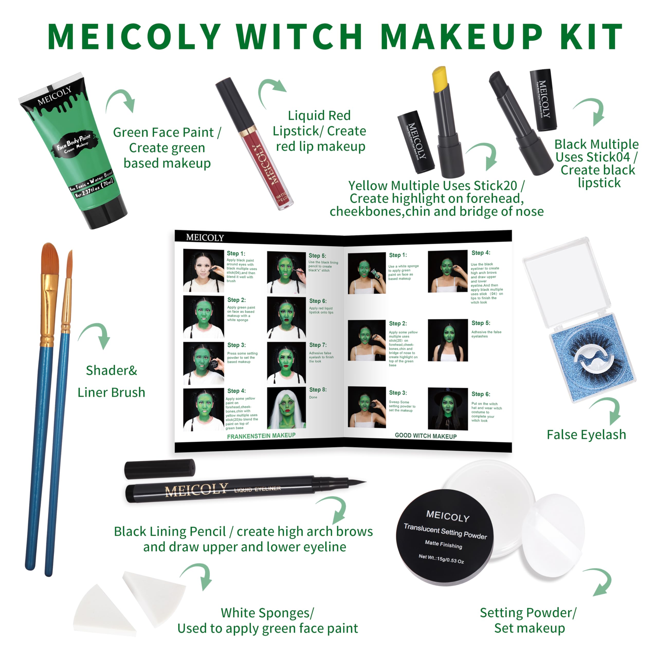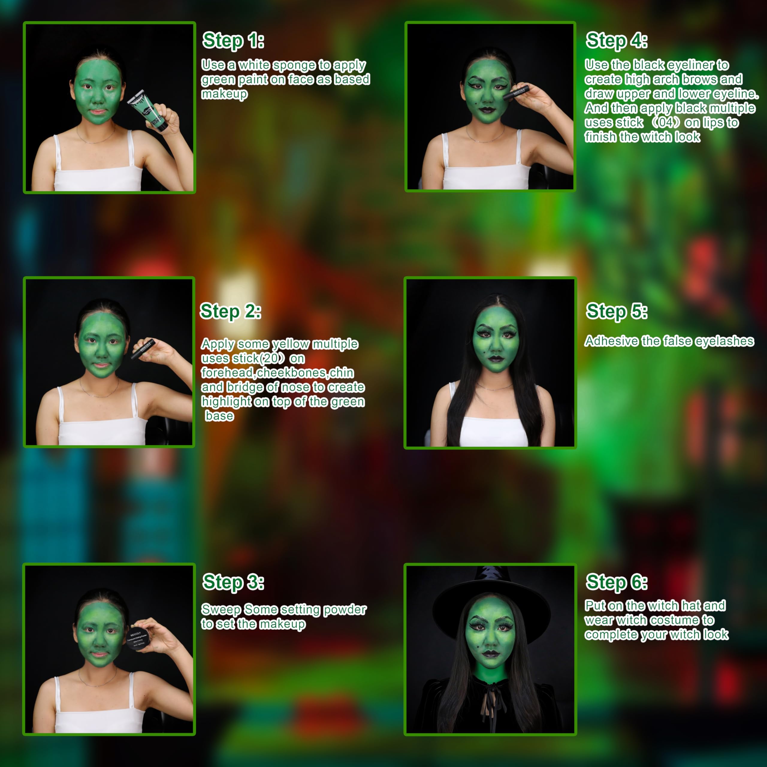 Complete Witch Makeup Kit: Our SFX makeup set comes with green face paint,black paint stick,yellow paint stick,setting powder,black lining pen,false eyelashes,red liquid lipstick,2 white sponges,2 brushes with a packaging box and instructions.Everything you need in one box to create stunning Witch, Elphaba,Frankenstein, or other spooky character looks – no need for separate purchases.