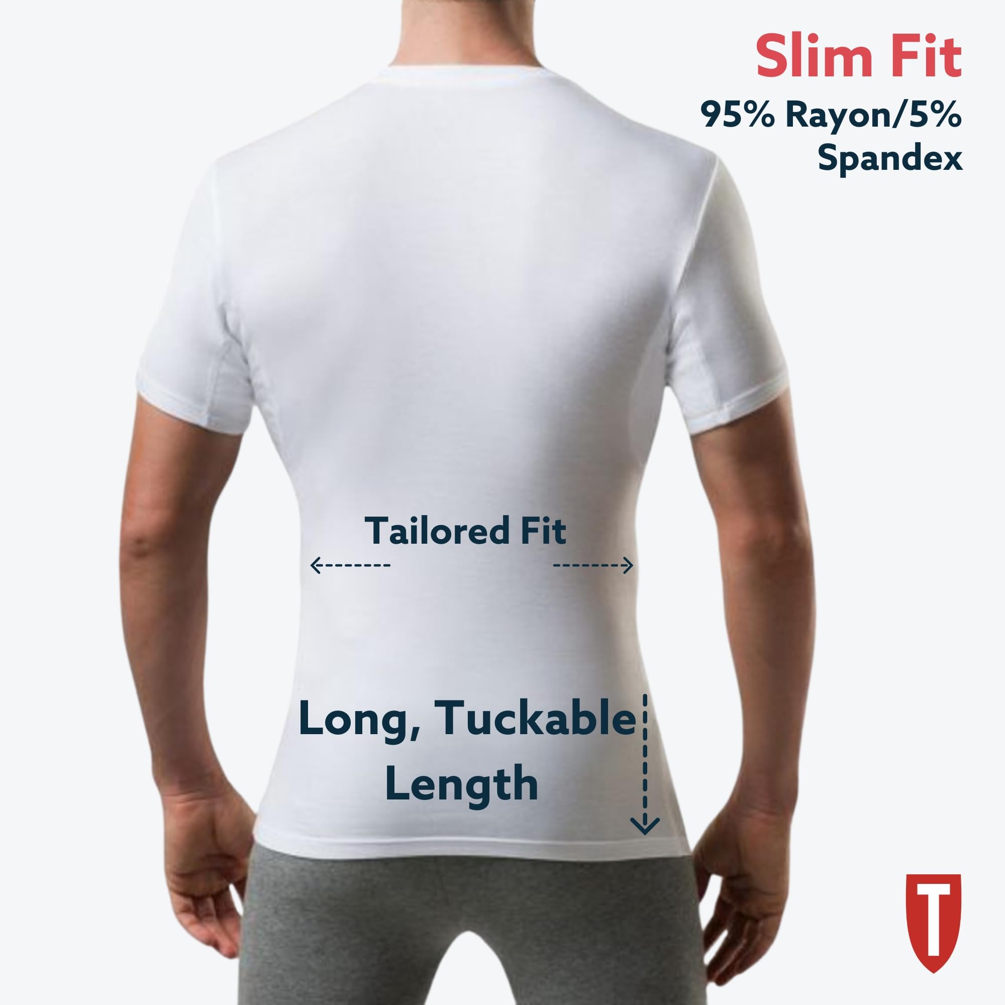 Versatile Sweat & Odor Defense T-Shirt: Our stylish men's crew neck undershirt complements any outfit while discreetly keeping sweat and body odor at bay, giving you the confidence to wear any dress shirt without fear of sweat marks; these slim fit undershirts are made from 95% premium rayon and 5% spandex, exclusive of the underarm pads inner layer; tagless with a lay-flat collar for a seamless, smooth fit